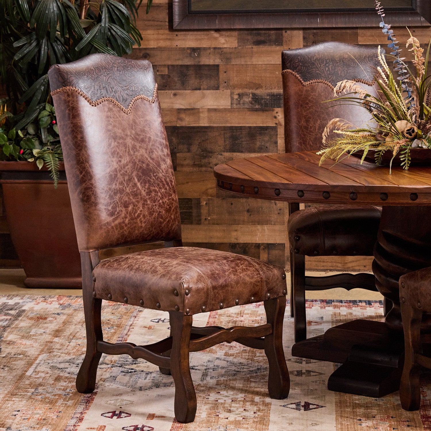 CUSTOMIZATION: Discover a wide range of luxurious leather colors and accent pairings to customize your own classic Western dining chairs that truly showcases your individual style. Allow the skilled team at Hat Creek Interiors to help you craft a unique piece that is tailored to your sophisticated preferences.
