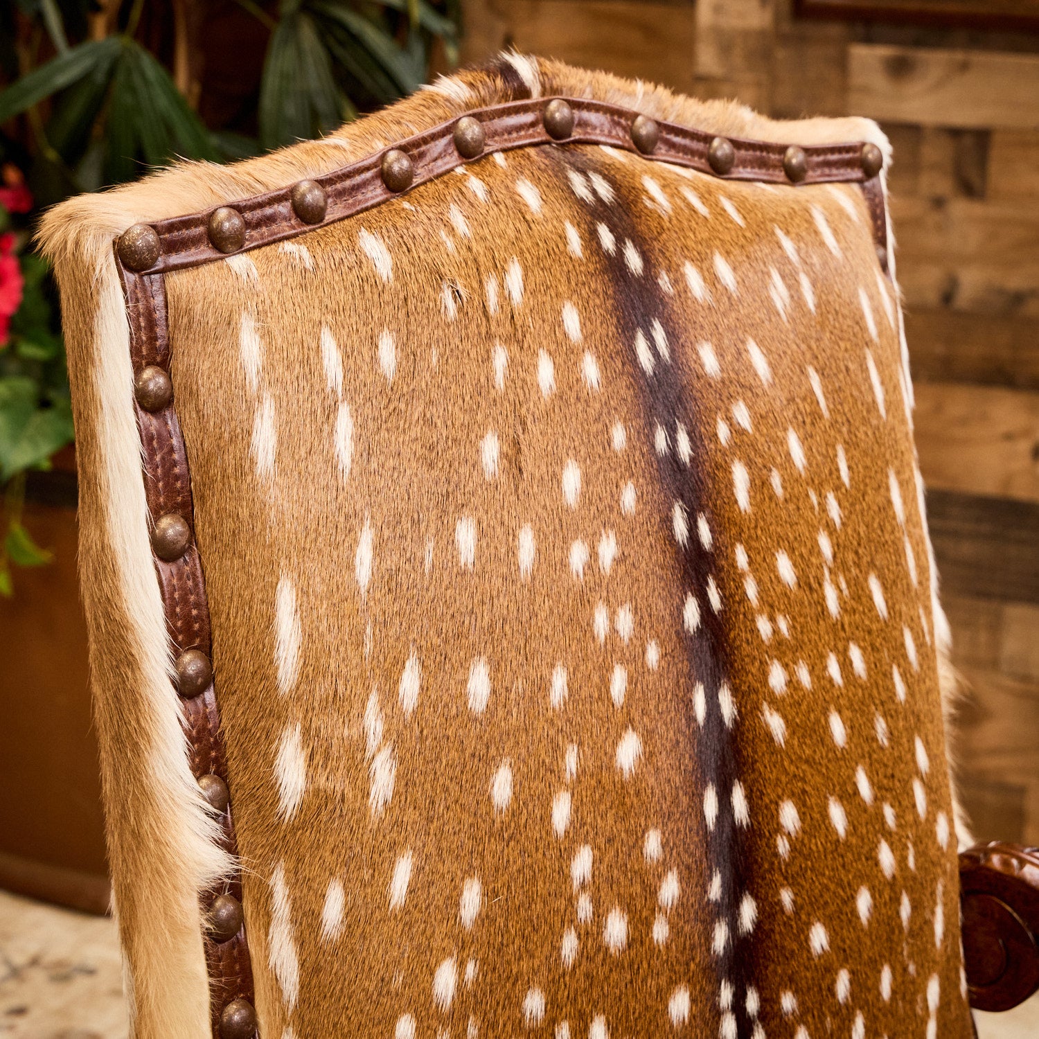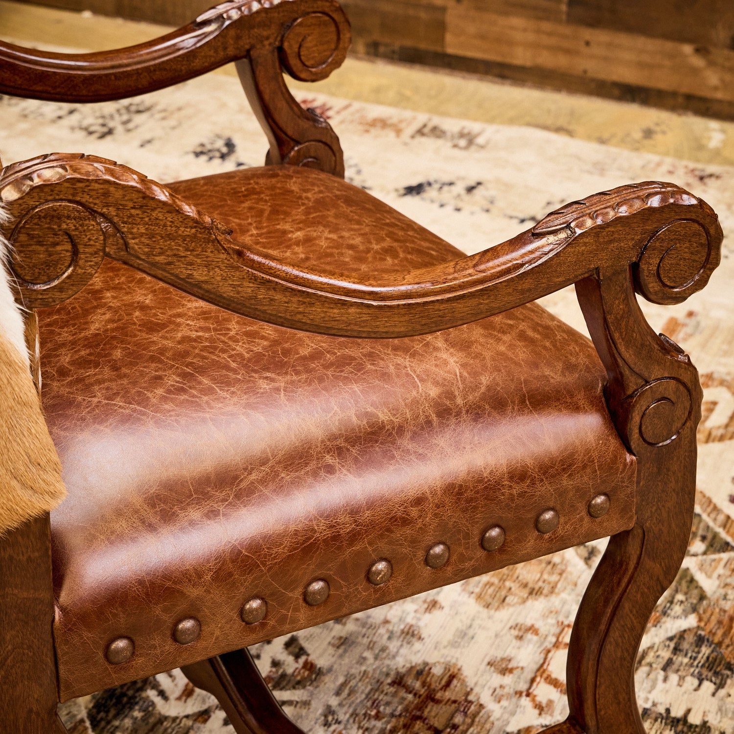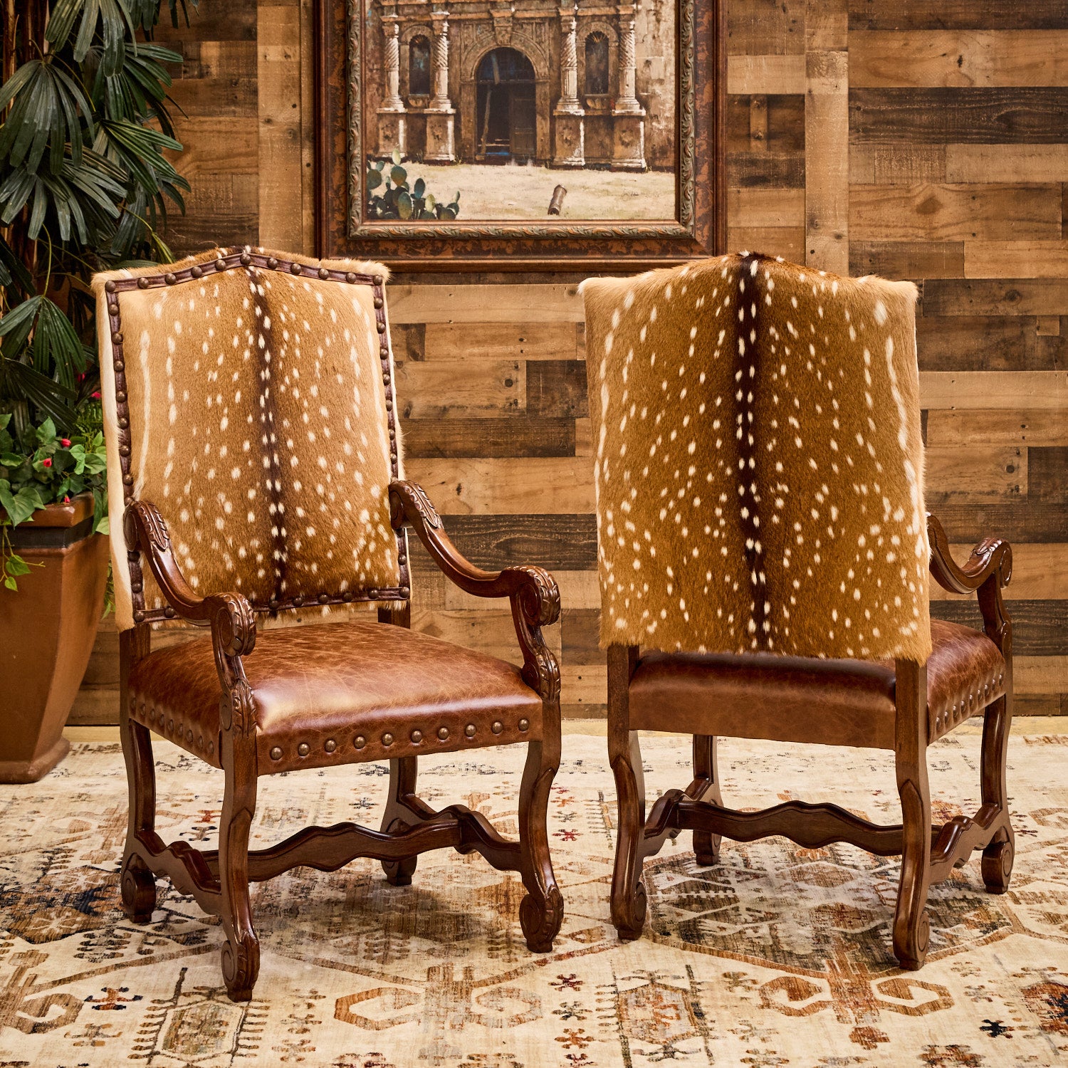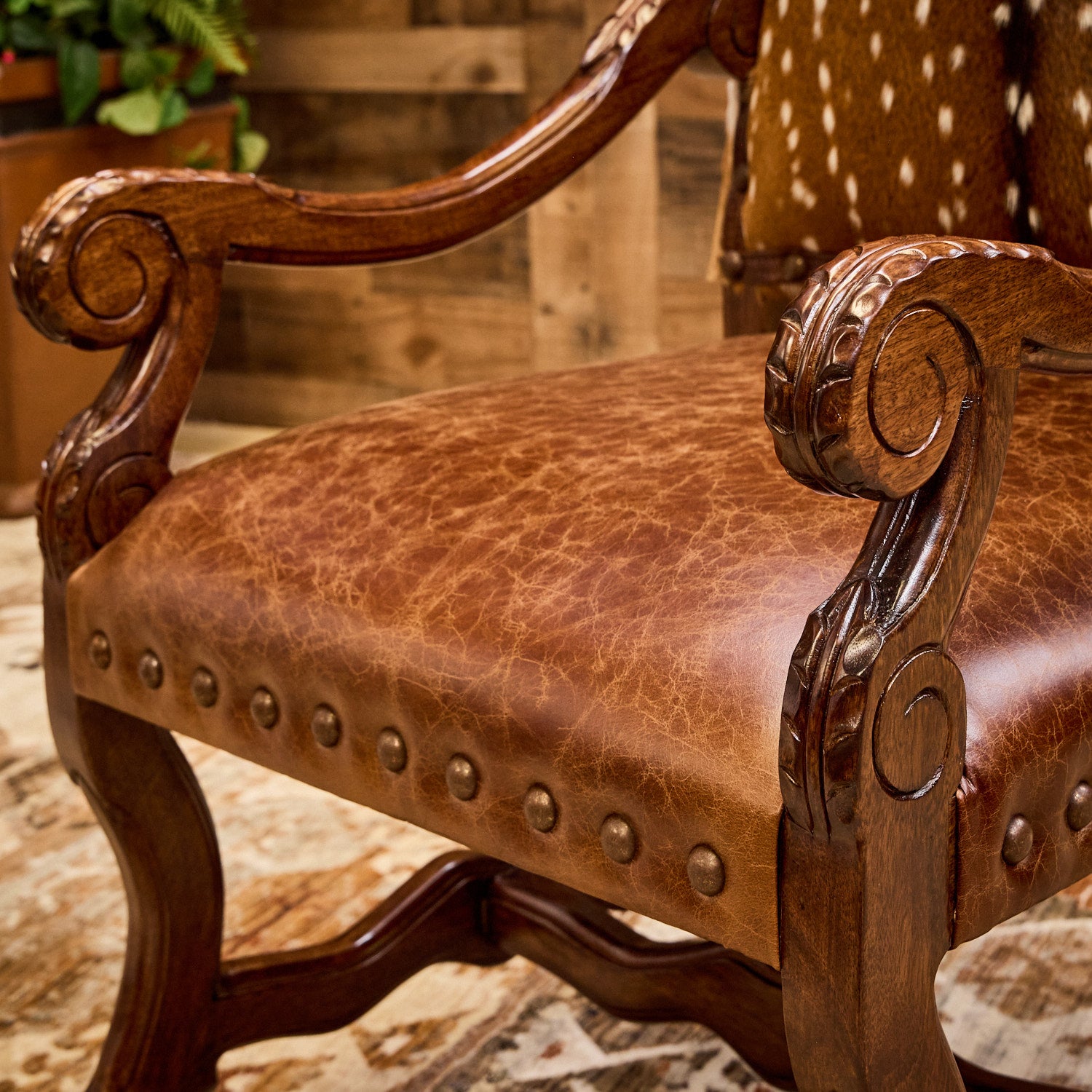 Discover the Vaquero Carved Chair, a masterfully handcrafted piece designed to captivate attention. Outfitted with genuine axis deer hide, a warm brown genuine top grain leather seat, and antique nailhead trim, this chair combines elegance with comfort. Its hand-carved mango wood frame not only enhances durability but also adds a sophisticated touch to any space. Ideal as dining armchairs or a striking addition to your living area, the Vaquero Carved Chair delivers both style and lasting quality, making it a distinguished choice for your home or office.