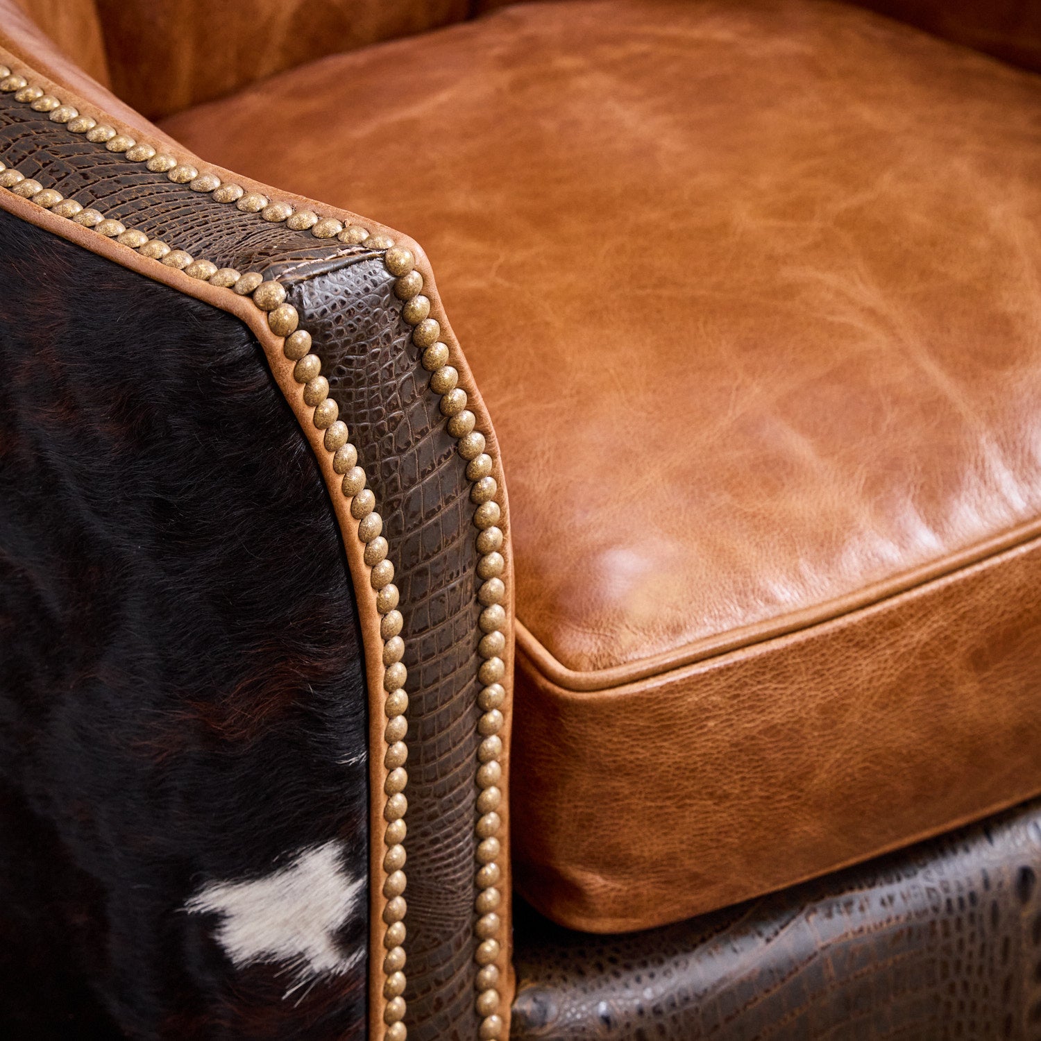 CUSTOMIZATION: Discover a wide range of luxurious leather colors and accent pairings to customize your own high-end Western accent chair and ottoman that truly showcases your individual style. Allow the skilled team at Hat Creek Interiors to help you craft a unique piece that is tailored to your sophisticated preferences.