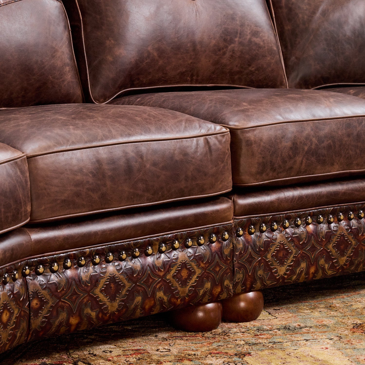 CUSTOMIZATION: Discover a wide range of luxurious leather colors and accent pairings to customize your own premium high-end Western sectional sofa that truly showcases your individual style. Trust the skilled team at Hat Creek Interiors to help you craft a unique piece that is tailored to your sophisticated preferences.