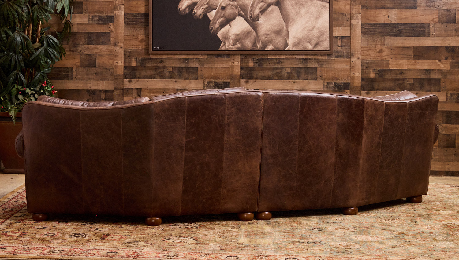 The Bosque Chocolate Curved Leather Sofa brings authentic Western character to your home with premium full-grain leather that will instantly be an eye-catching centerpiece in your living space!  Meticulously hand crafted here in the USA, this character-rich leather will nicely patina over time, revealing even more character markings that will be specific to your home for many years to come.  Back cushions are adorned with a yoke stitch pattern, which is accented with a rich embossed leather, creating a unique Western style that you won't find just anywhere.  The same embossed leather accents can also be seen on the arm fronts and lower front rail, creating the perfect amount of refined detail and depth. The curved silhouette offers generous deep seating, while natural leather variations—wrinkles, creasing, and color shifts—tell the story of a piece that grows more beautiful with use. A timeless statement for those who appreciate quality craftsmanship and rustic elegance.