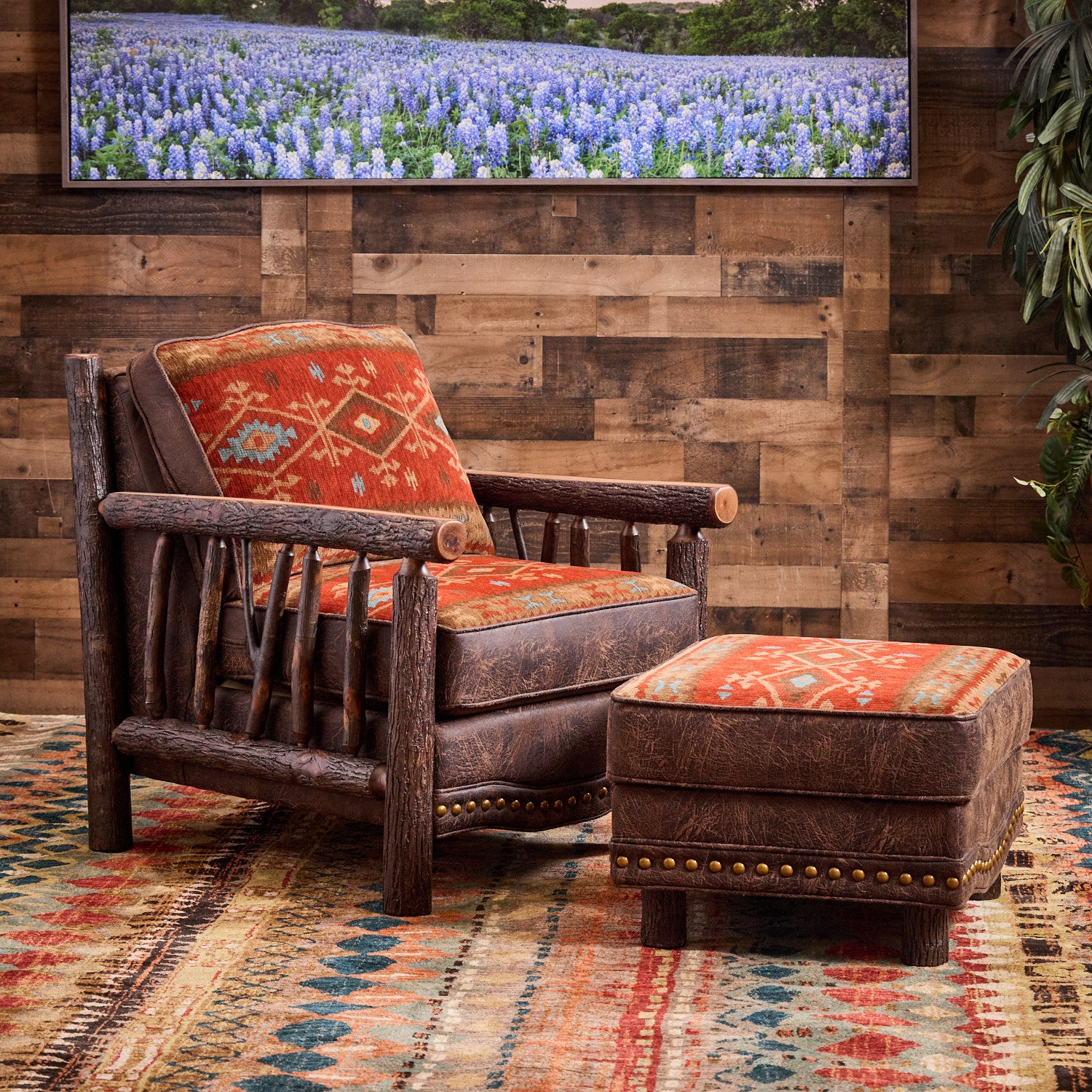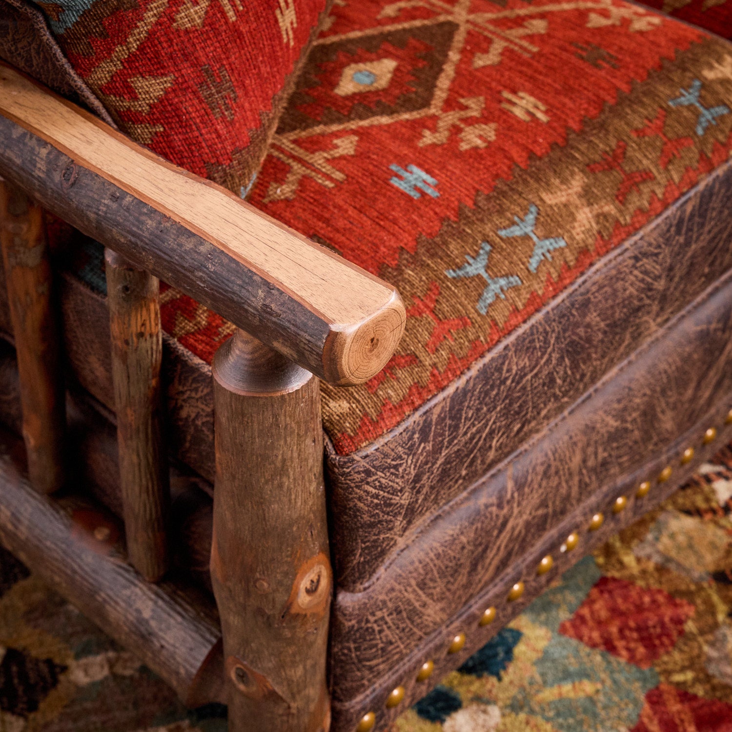 Constructed deep in the heart of the USA, the Red River Hickory Collection is hand-made on a sturdy, solid hickory frame, which is paired with cushioning that offer a comfortable, cloud-like experience while exuding a rich rustic charm. The striking Southwestern-inspired fabric is matched with a luxurious, leather-like material that is both chic and simple to maintain. This set features a sofa, loveseat, and chair/ottoman (Chair/ottoman not shown).