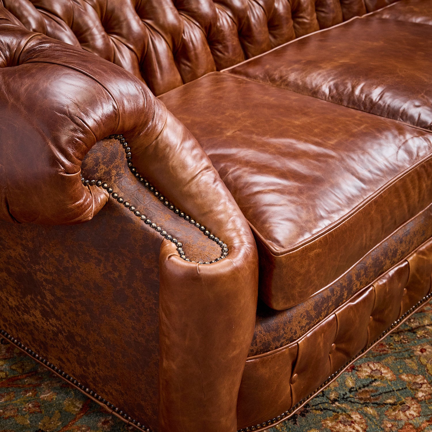 Experience true American craftsmanship with the Spanish Fork Western Leather Sofa. Crafted on a sturdy hardwood frame featuring an 8-way hand-tied spring system, this classic Chesterfield design combines rustic warmth with refined elegance. Its dark brown embossed  leather accents adds depth and character, making it a striking centerpiece suitable for diverse home or office styles.