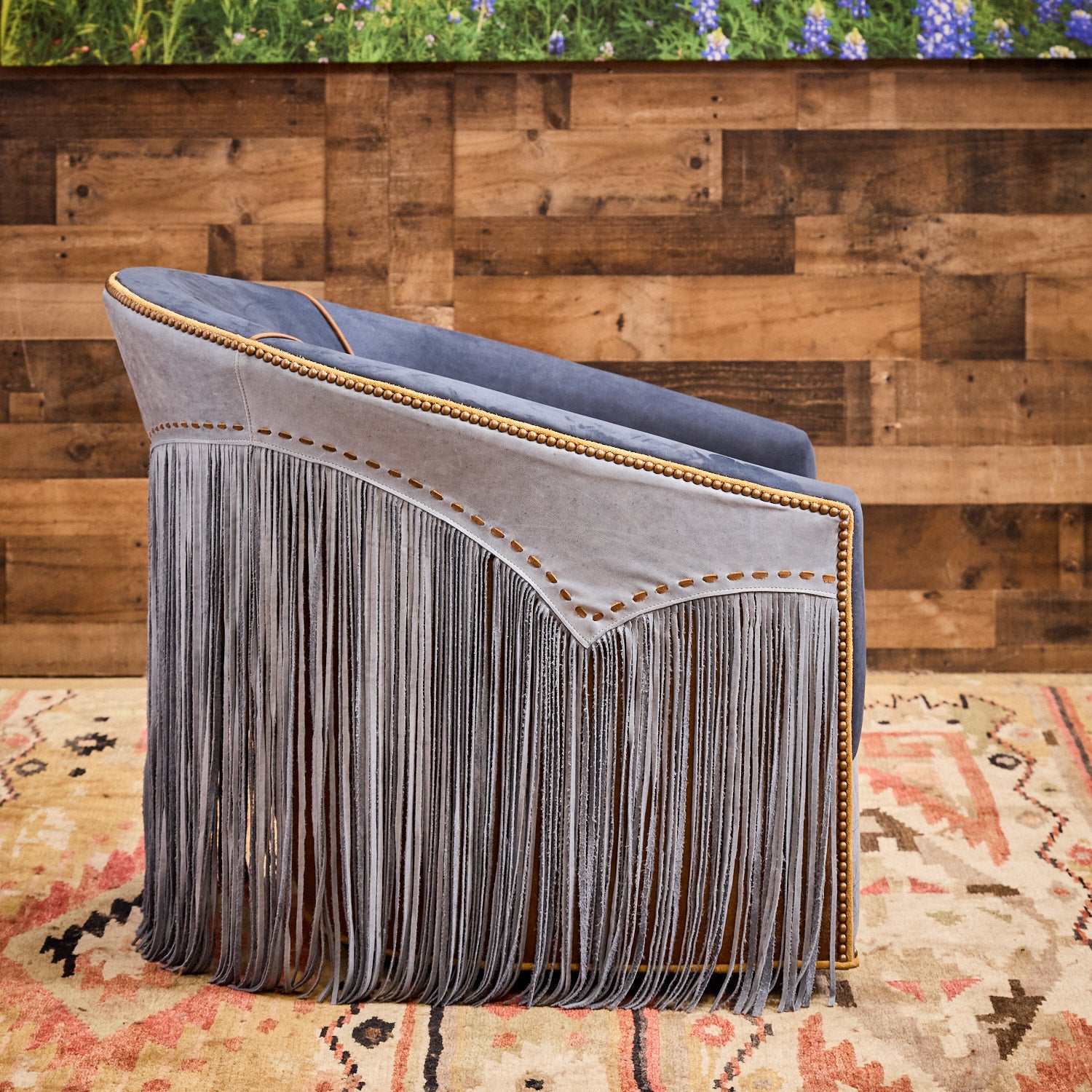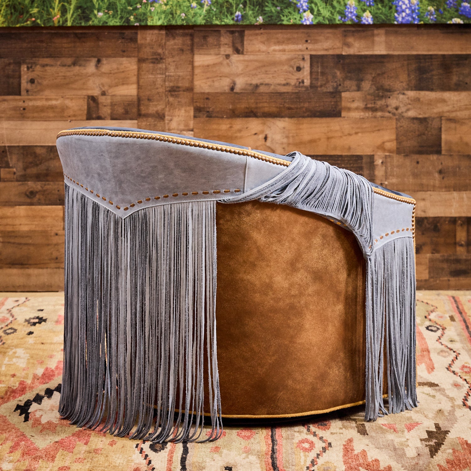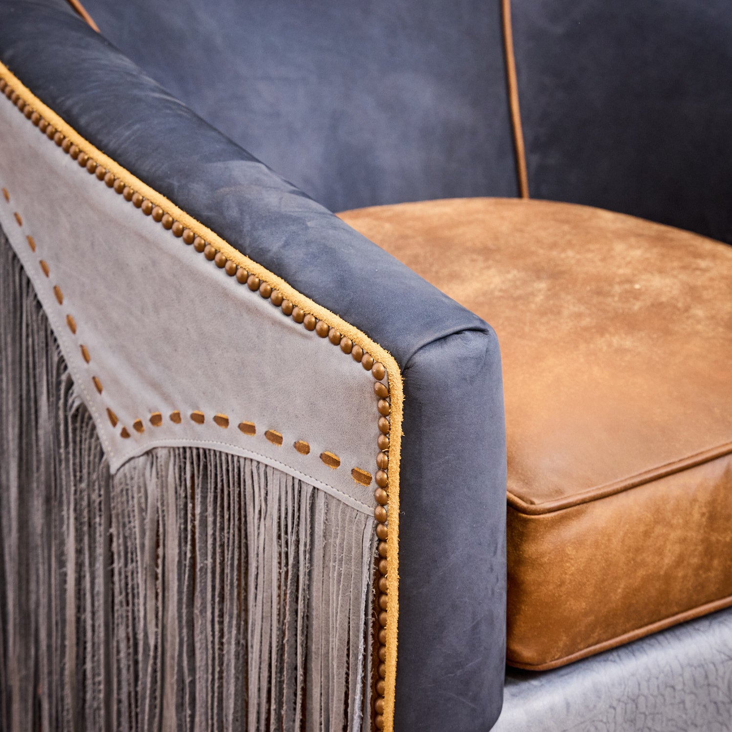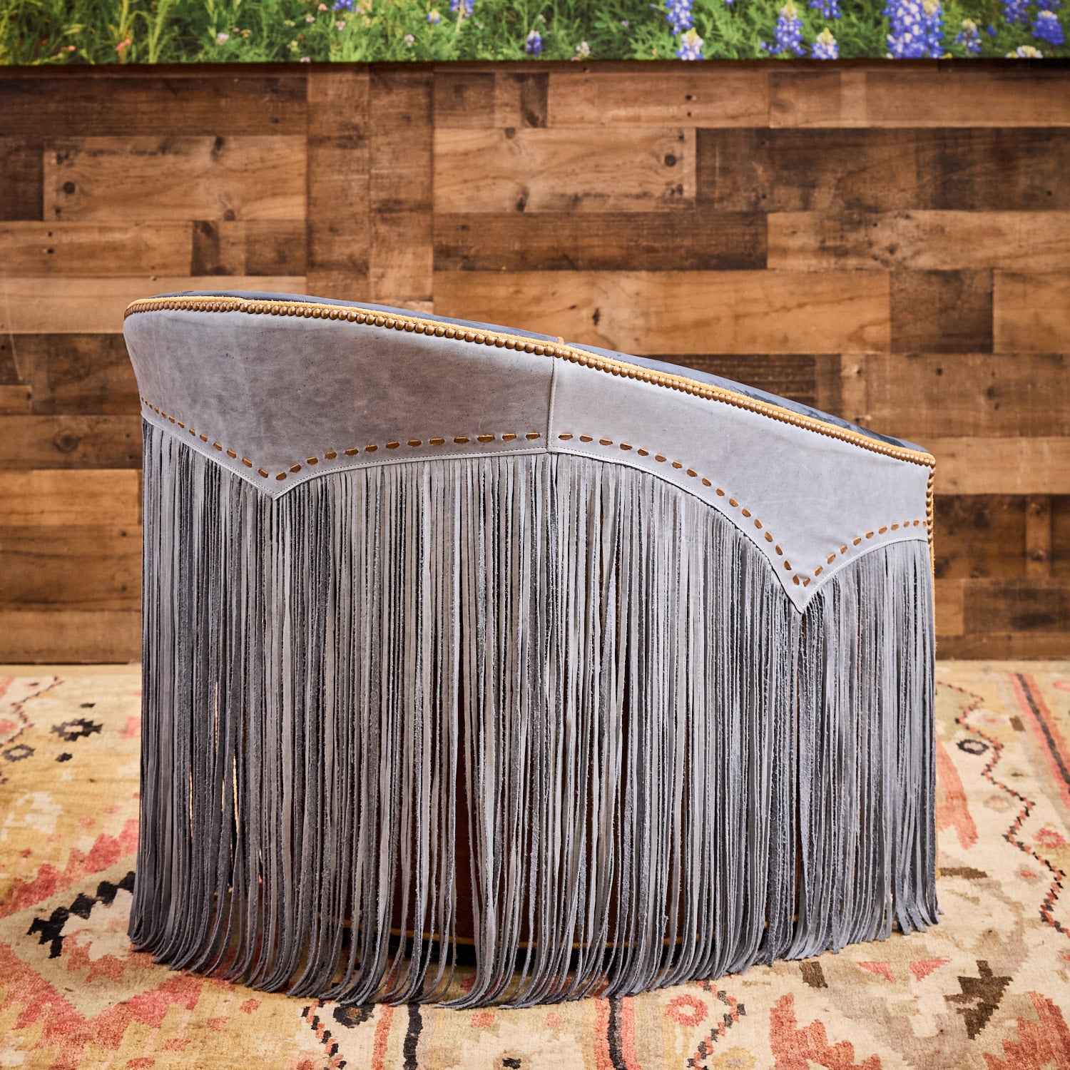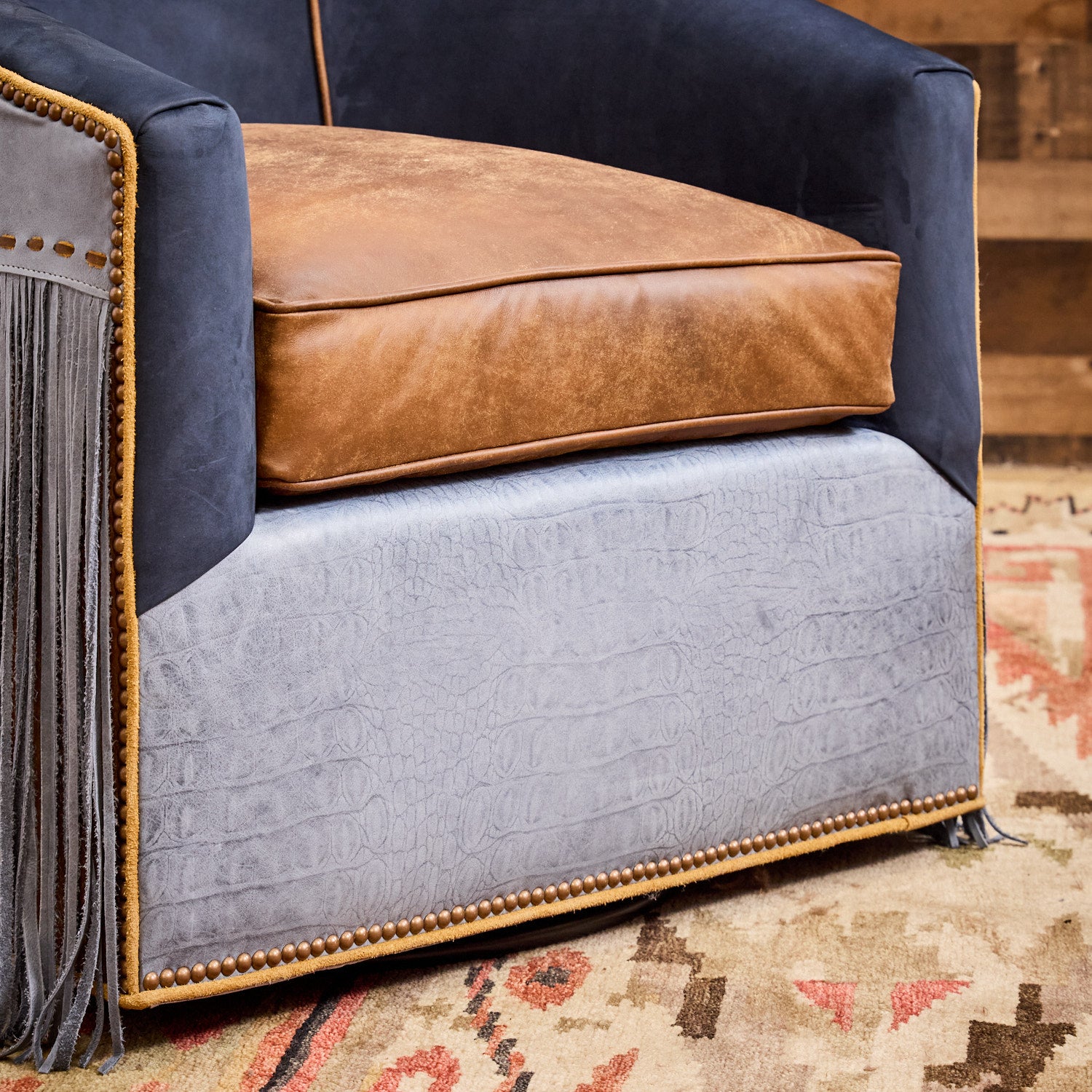 Bring a distinct Western flair to your home or office with the Blue Lagoon Western Swivel Chair. Hand-crafted here in the USA from soft supple blue top-grain leather, these stylish chairs feature a super-fun look with extra-long hand-cut leather fringe and contrasting piping. The distressed leather seat offers a complementary contrast that enhances the chair’s authentic Western design. Equipped with a full 360-degree swivel, this chair delivers both comfort and practicality. An optional boot stitch detail on the front lower rail adds a refined Western touch that will instantly be the envy of your friends and family!