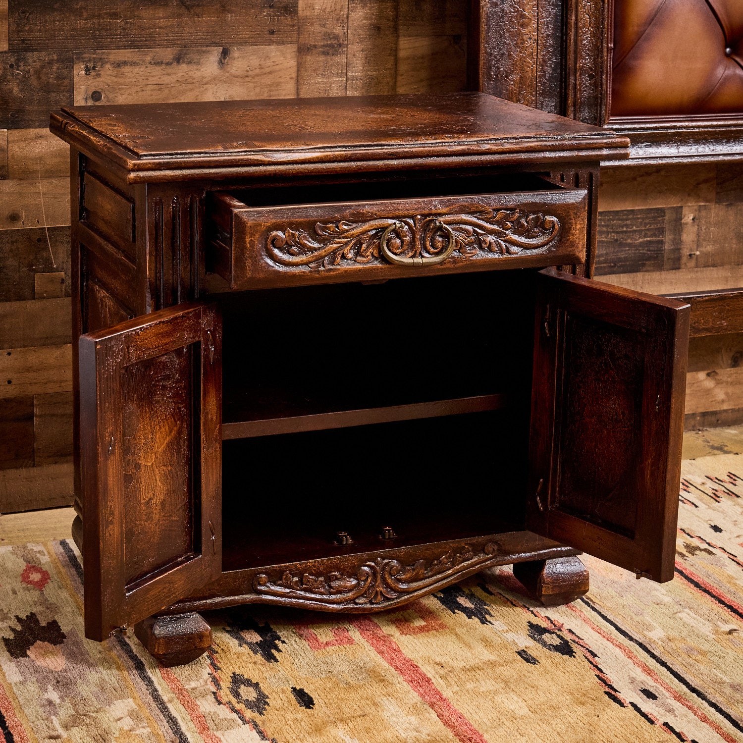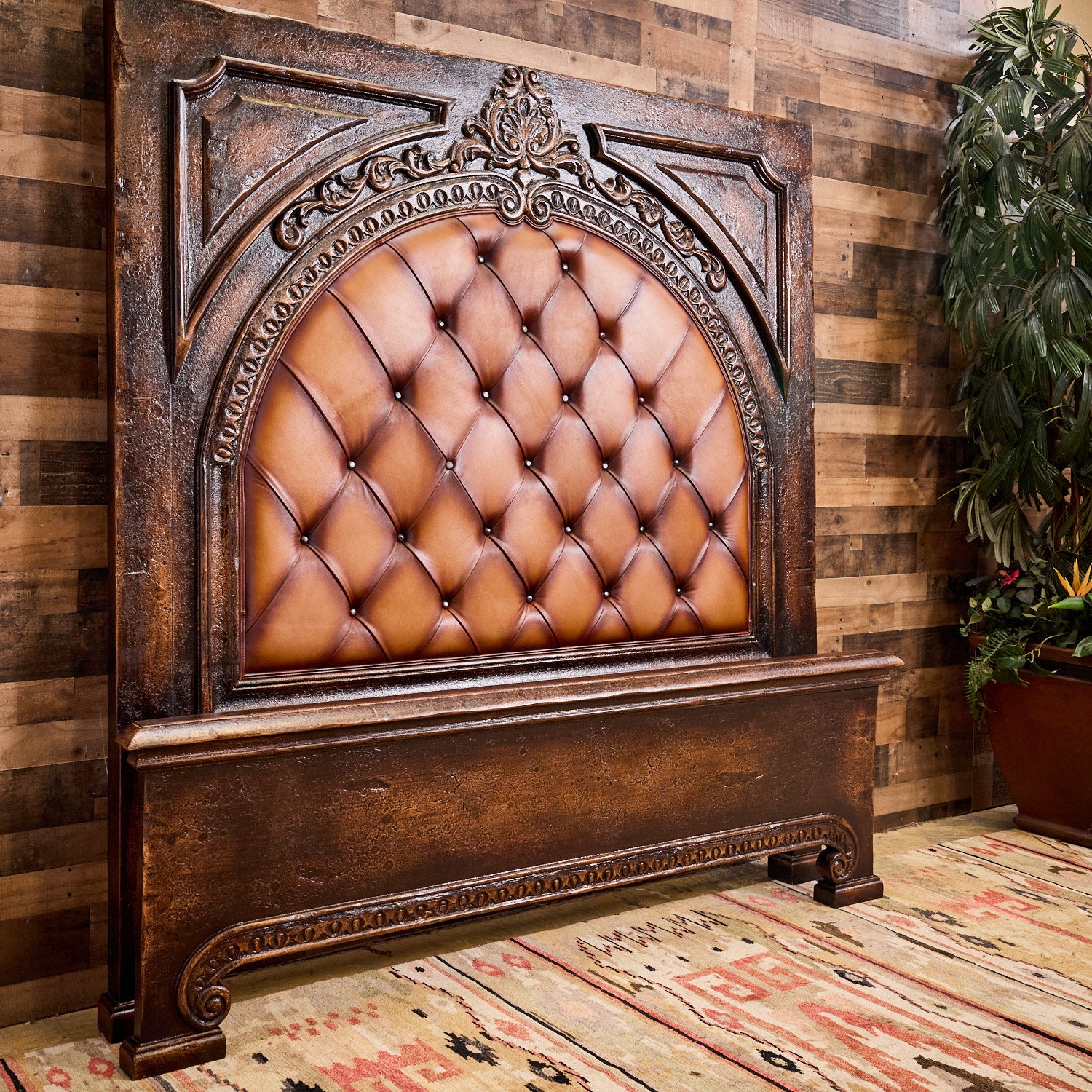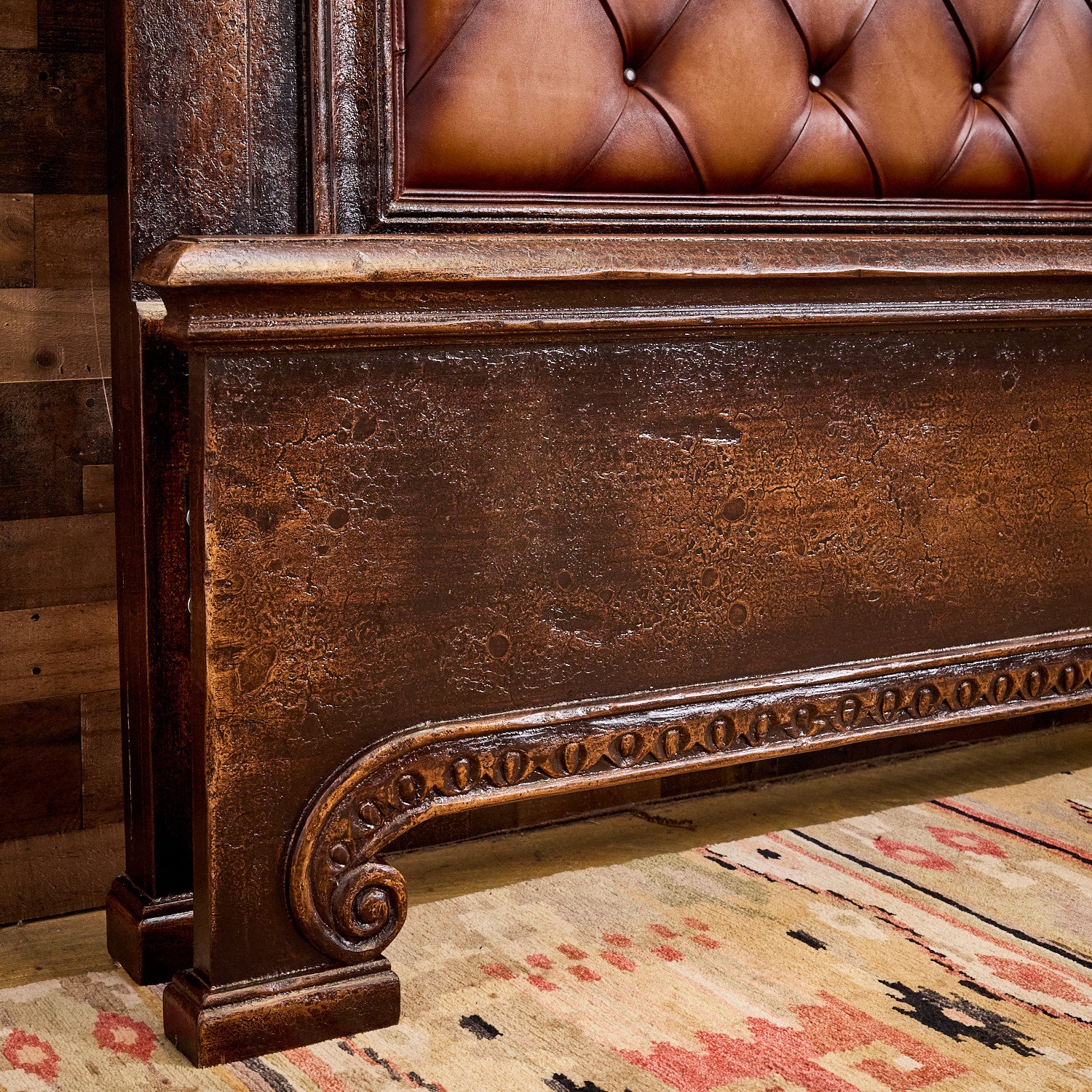Meticulously hand-crafted in Peru, the Katana Leather Bed (King Size) offers warm rich style that will instantly be the focal point in any bedroom style.  Built using a tropical hardwood called Mohena, this luxurious bed will instantly provide a bold beauty like none other.  Whether your room is on the high-end rustic style, or perhaps more of a modern look, this set will coordinate nicely while adding a pop of sophisticated style with a subtle Spanish flare with its hand-painted textured finish and upholstered tufted leather headboard.  The matching nightstands (Sold Separately) offer ample surface area for lamps, phones while the drawer and lower cabinets provide useful storage space. The matching hand-painted textured finish creates continuity in a set that is a true work of art!