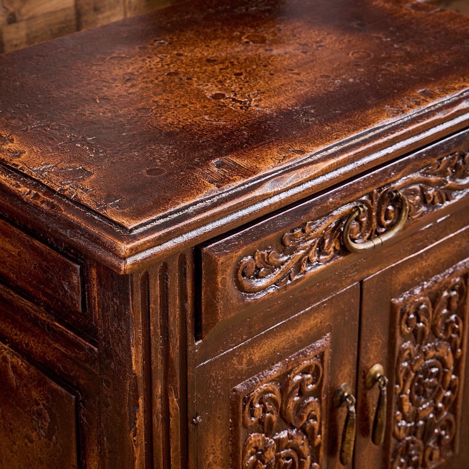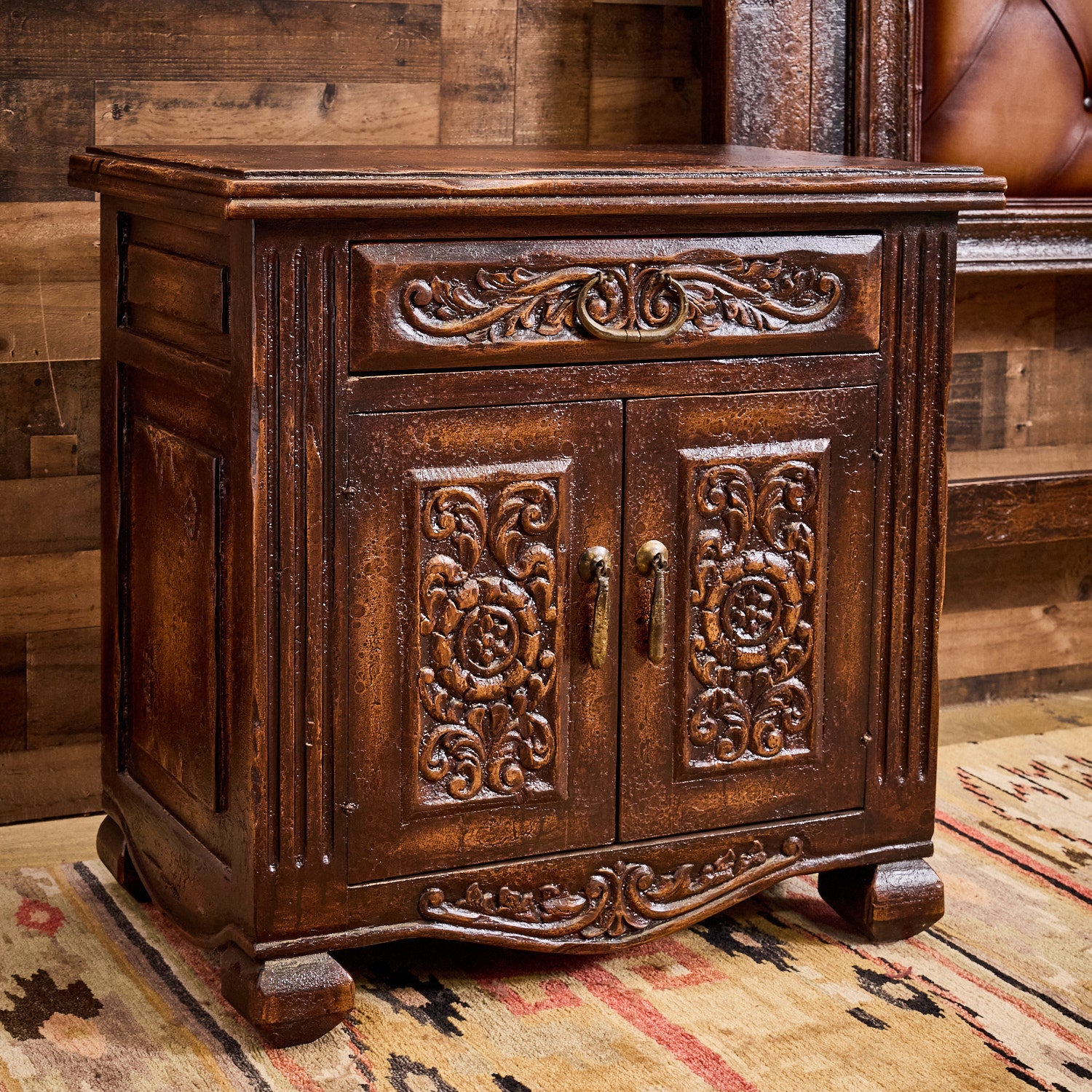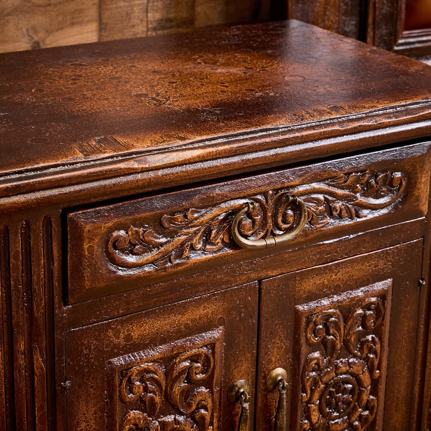 Meticulously hand-crafted in Peru, the Katana Leather Bed (King Size) offers warm rich style that will instantly be the focal point in any bedroom style.  Built using a tropical hardwood called Mohena, this luxurious bed will instantly provide a bold beauty like none other.  Whether your room is on the high-end rustic style, or perhaps more of a modern look, this set will coordinate nicely while adding a pop of sophisticated style with a subtle Spanish flare with its hand-painted textured finish and upholstered tufted leather headboard.  The matching nightstands (Sold Separately) offer ample surface area for lamps, phones while the drawer and lower cabinets provide useful storage space. The matching hand-painted textured finish creates continuity in a set that is a true work of art!