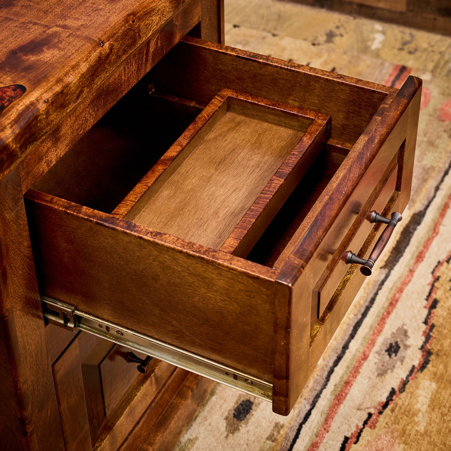 This amazing work of art practically speaks for itself!  The Ruger Mesquite Executive Office Desk will instantly take any office to the next level with its rich rugged style and sophisticated uniquely rustic vibe.  Hand crafted using solid mesquite wood, which is a very dense wood known for its amazingly beautiful grain pattern and warm character throughout.  Shown here with a natural stain finish and expertly placed black epoxy & copper swirl inlays (optional).  Each drawer is outfitted with smooth full-extension glides for ease of use and functionality.  This one-of-a-kind office desk is also equipped with tons of space for your hanging files and other drawers for tons of additional storage.  Along the desk top you will notice its natural/live edges that offers wonderful character, completing this the overall rich elegant look.  The Ruger Mesquite Executive Office Desk will undoubtedly be a stunning centerpiece in your office for years to come!