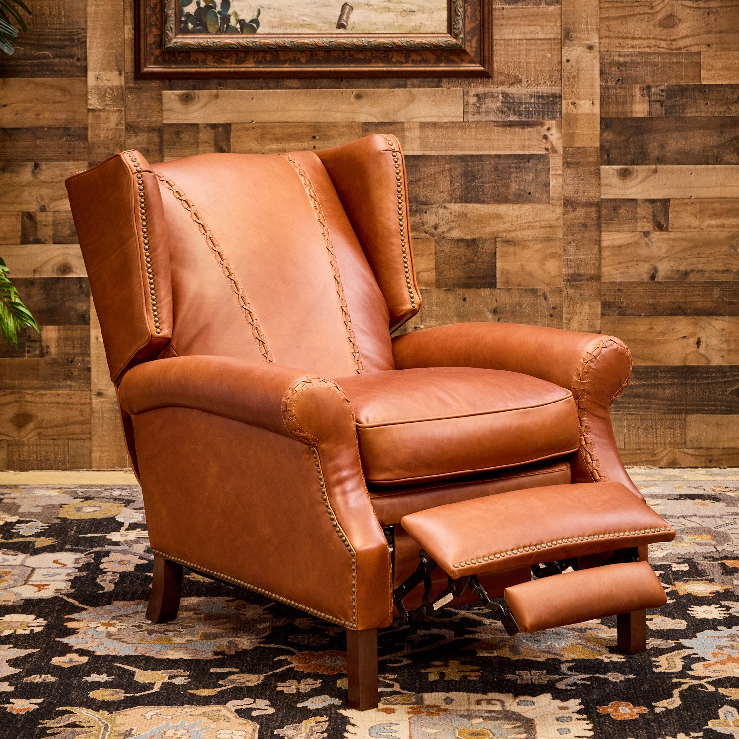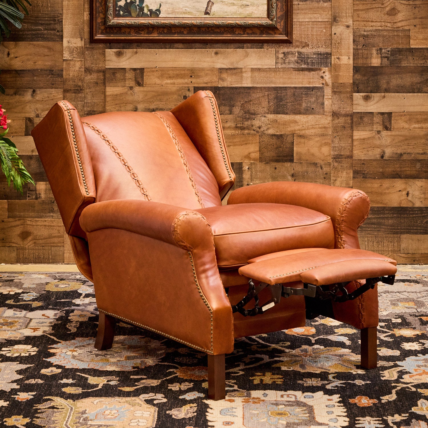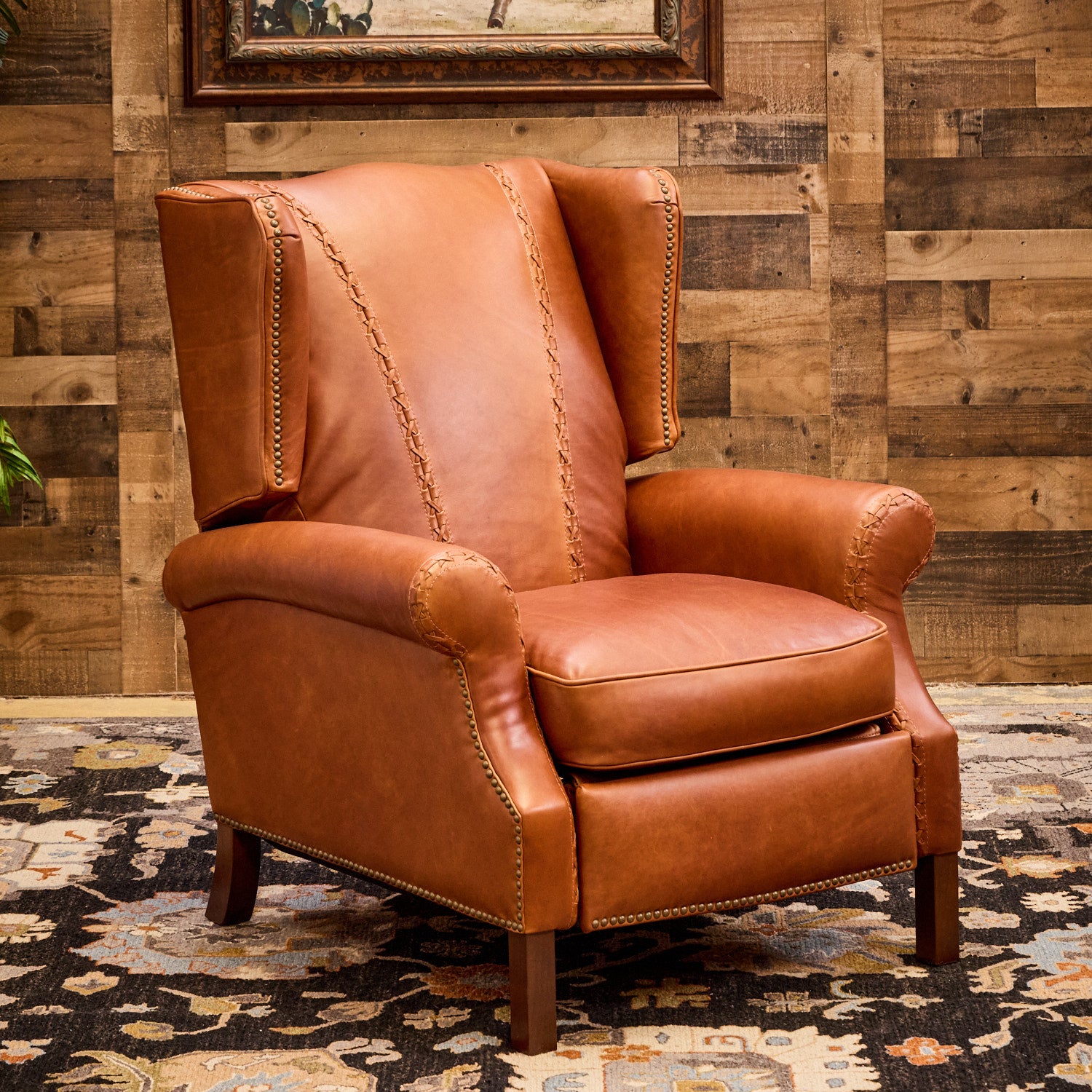 The El Rosa Stitched Leather Recliner offers a distinctive blend of refined leather luxury and rustic charm. Expertly crafted with premium materials and superior construction methods, this wingback recliner ensures immediate relaxation after a long day in the saddle. Featuring rich full-grain leather complemented by meticulously hand-stitched accents on the back and arm fronts, it delivers a one-of-a-kind aesthetic that will instantly stand out in any setting.