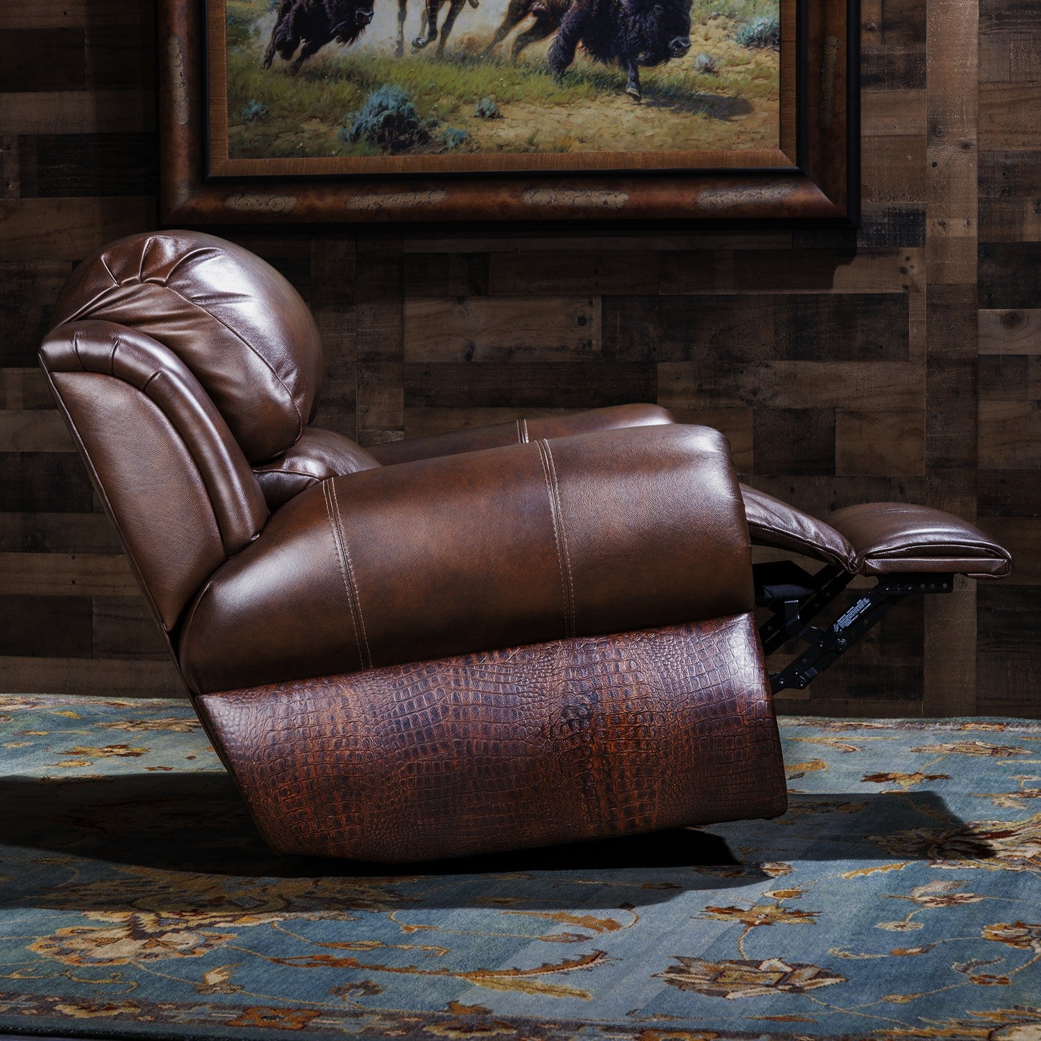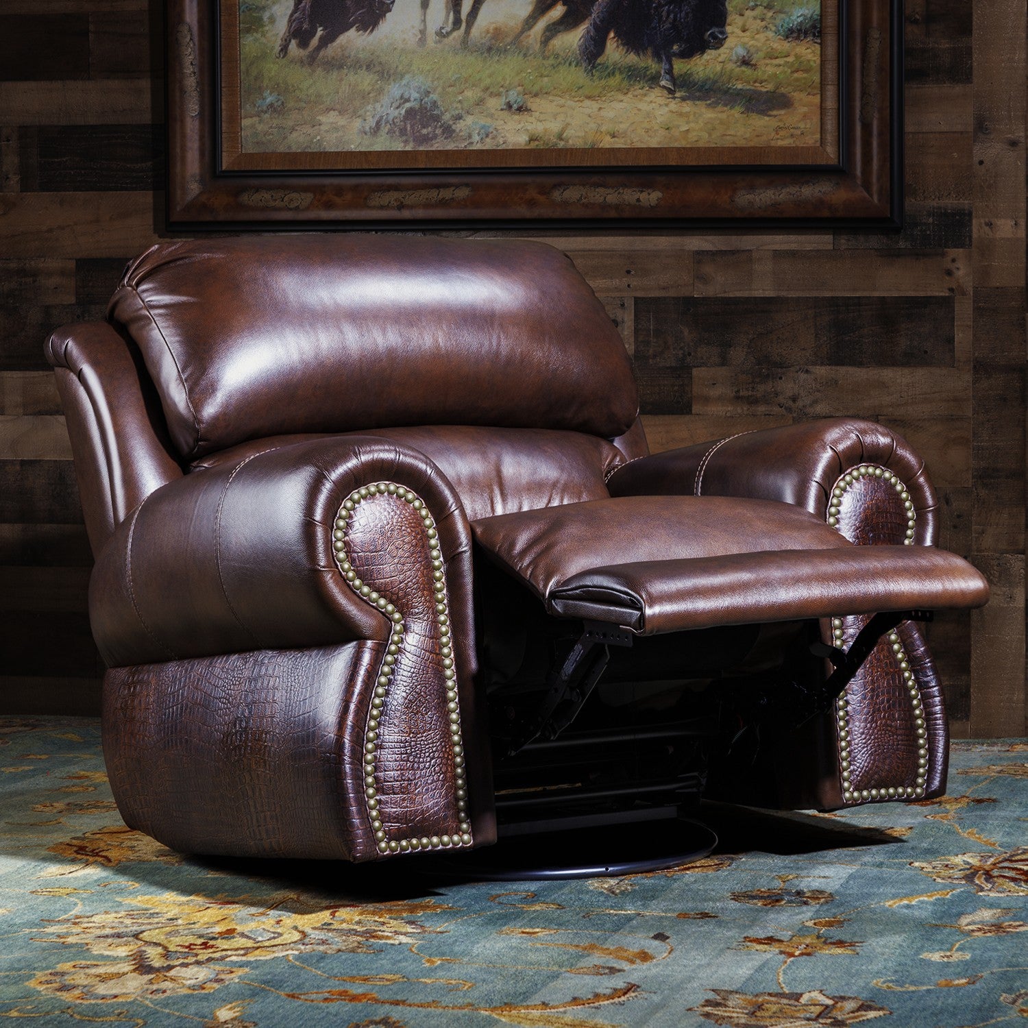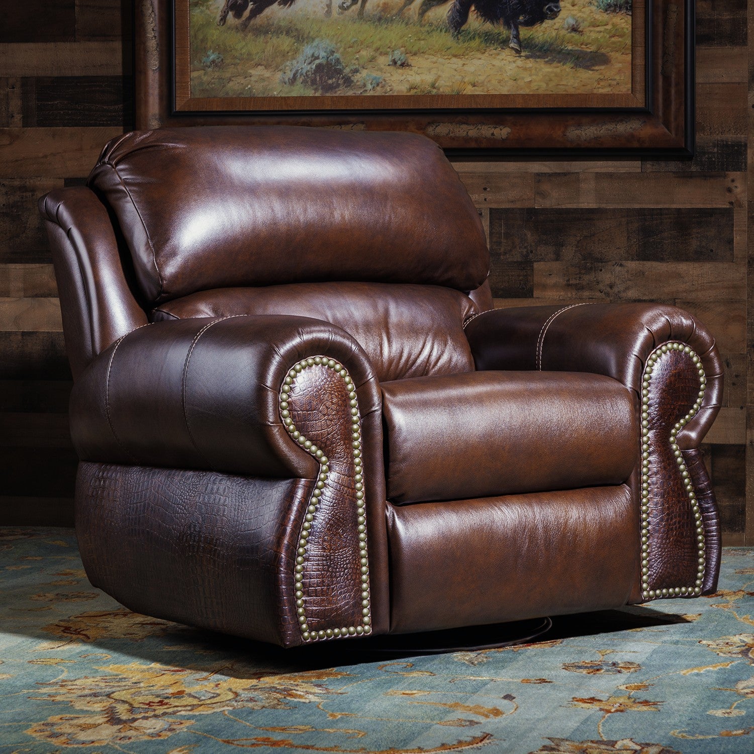 After a long day in the saddle sink into the luxurious supple comfort of the Springlake Coralino Leather Recliner.  Intricately hand-crafted here in the USA on a solid hardwood frame and shown here in a buttery soft top grain leather, this swivel-glider-recliner is all about comfort and relaxation.  Accented with striking embossed leather gator accents (optional) and antique nailhead trim, this recliner will be the envy of your family from the moment it enters your living room!