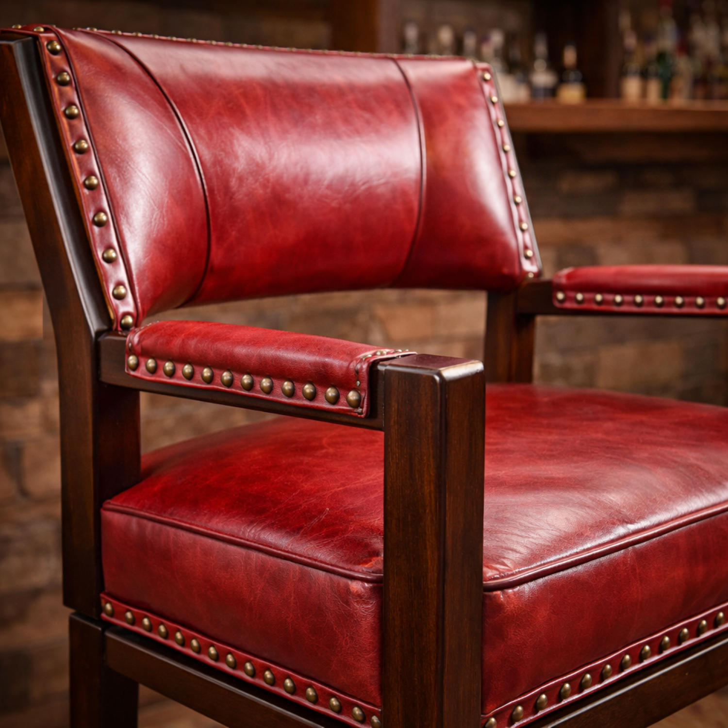 Crafted from solid hardwood with meticulous attention to detail, the Gunsmoke Leather Bar Stool brings refined sophistication to your bar area or entertaining space. The rich red hand-burnished leather upholstery is complemented by antique nailhead accents, creating an elegant rustic flare from top to bottom. A memory return swivel mechanism ensures smooth, comfy seating for great times with family and friends. These expertly constructed bar stools seamlessly blends traditional craftsmanship with practical functionality and perfect for a warm Western/rustic style home or even an area that is more on the modern side.  This versatility makes the Gunsmoke Leather Bar Stools the perfect choice for those searching for both rich style and durability.  Available as bar or counter stools.