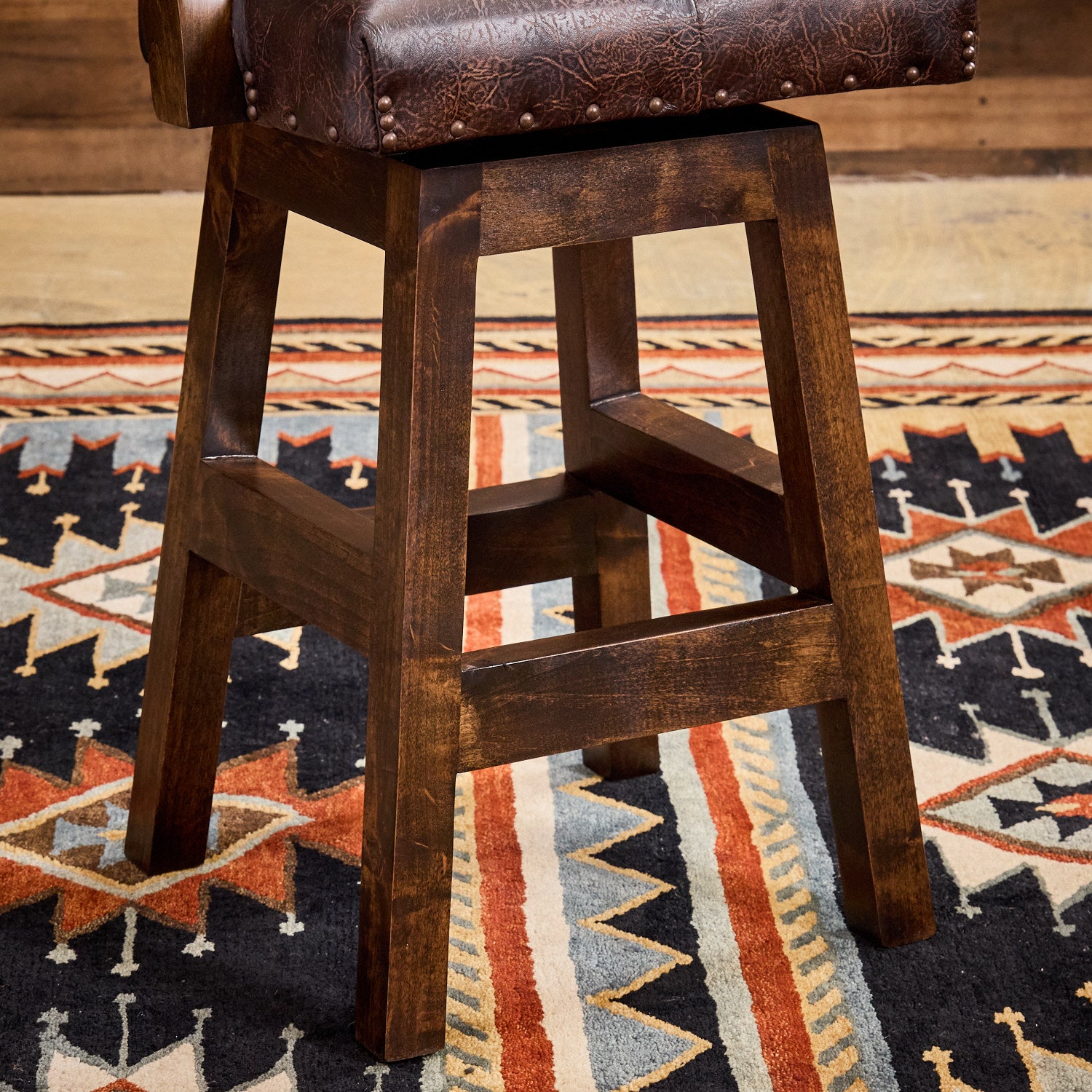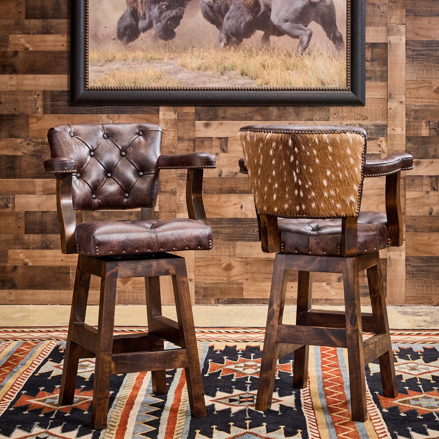Discover the Wichita Axis Leather Bar Stool, a refined blend of Western luxury and rustic craftsmanship. Hand-made right here in Texas USA on a solid knotty alder wood frame and using only premium authentic Axis deer hide and hand-tufted top-grain leather, this stool showcases exceptional quality and elegance. Beyond its eye-catching aesthetics, it provides superior comfort and practicality with a smooth 360-degree swivel. Available in both bar and counter heights, each stool is engineered for optimal comfort and will instantly provide an ultimate rich rustic accent in your home's bar or kitchen area.