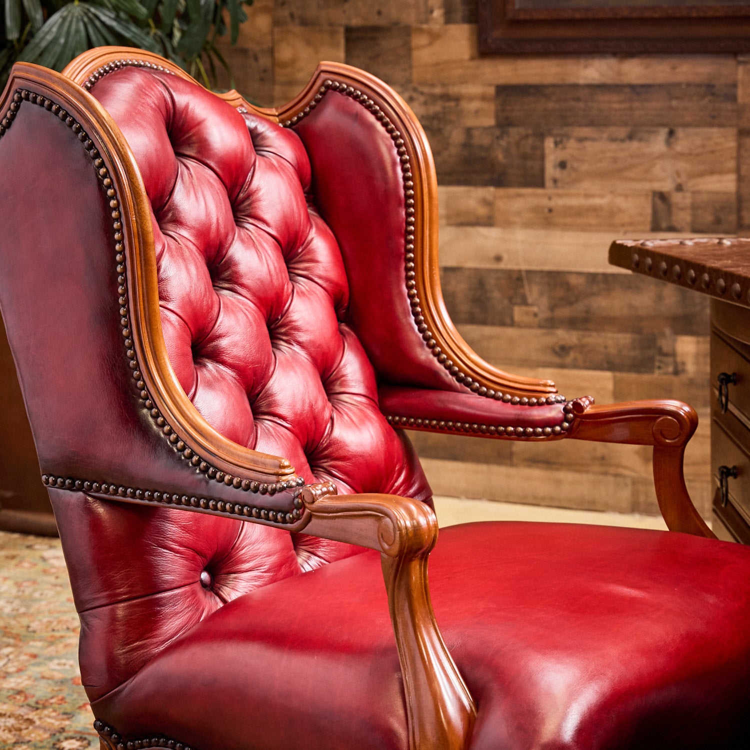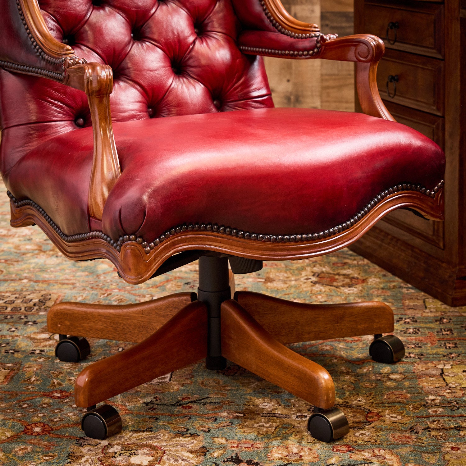 Operate your business or home office with refined elegance with the Caliente Leather Office Chair. Crafted by hand in the USA, this chair offers enduring comfort combined with a timeless rustic yet upscale design. The hand-antiqued red leather will instantly introduce a vibrant pop of color to your workspace, delivering the perfect blend of rustic style and warm comfort.  Shown here with hand-tufting on the inside back (optional).  Chairs are equipped with a 360-degree swivel motion and hydraulic height mechanism, with and easy-to-reach adjustment handle on the lower right side.