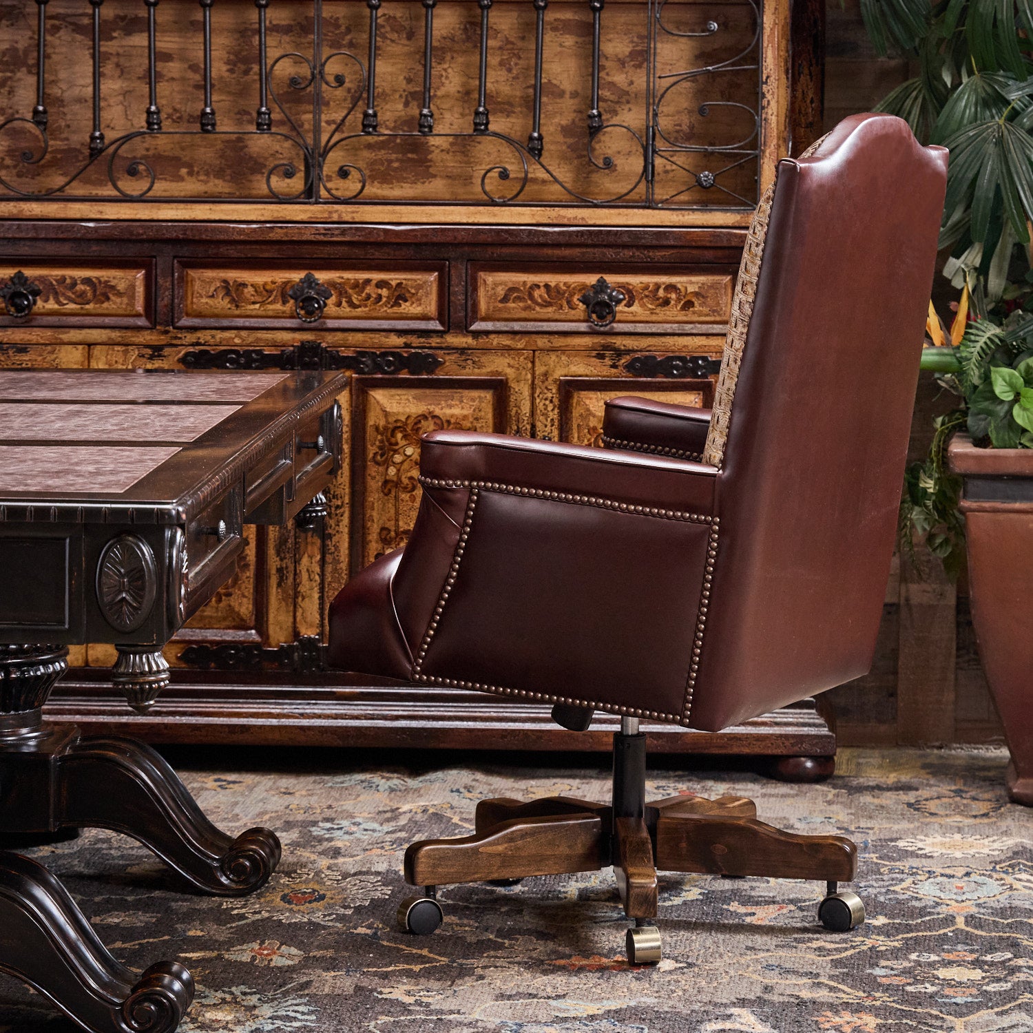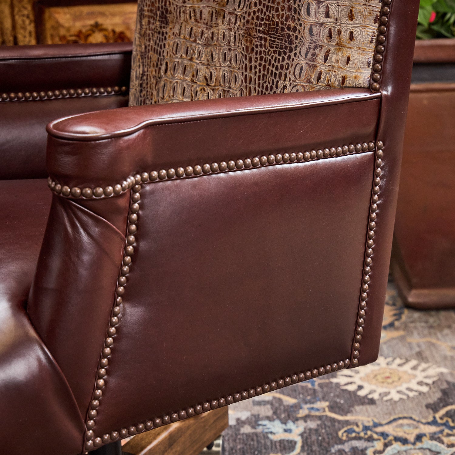 Elevate your office space with the Croc Western Leather Office Chair, a masterfully constructed piece that instantly brings authentic rustic elegance to your workspace. Handcrafted in here in Texas using premium full grain leather and striking embossed croc-pattern leather accents on the back panel, this chair combines heritage craftsmanship with practical functionality. Vintage-inspired nailhead trim adds distinctive visual appeal while reinforcing its Western roots. Engineered for all-day comfort and professional style, the Croc Western Leather Office Chair features a smooth 360-degree swivel feature, smooth-rolling casters for mobility, and hydraulic seat adjustment to customize your ideal working height. A refined choice for those seeking both style and a unique eye-catcher in their office space!