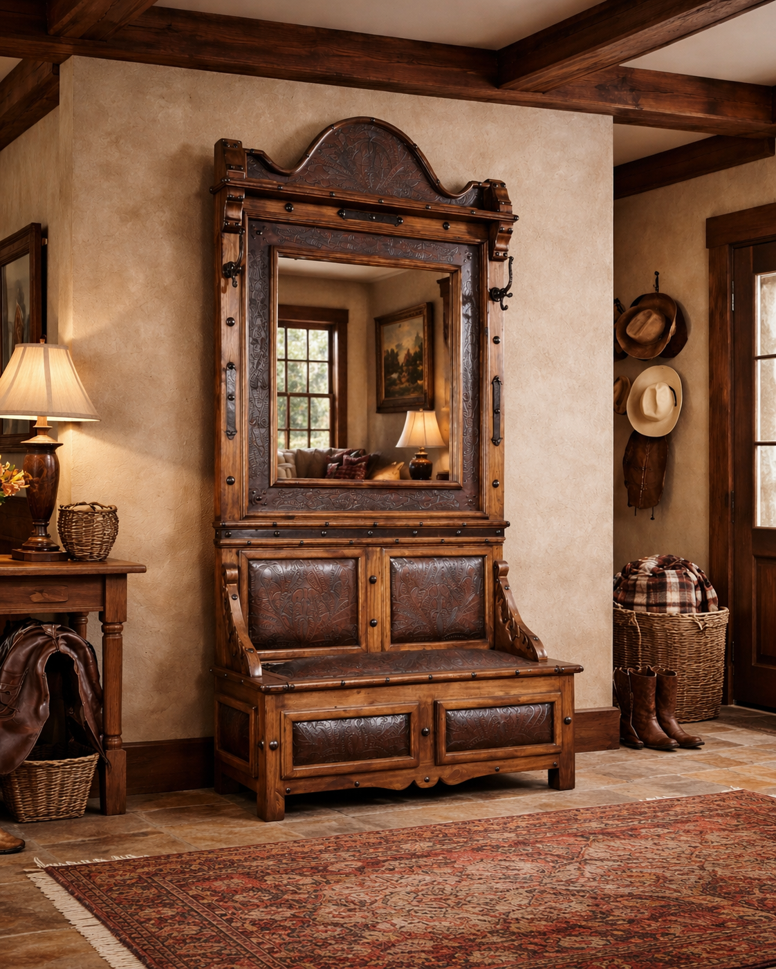 Add the perfect touch of Hacienda elegance to your home's entryway with the Jalisco Tooled Leather Hall Tree. Built on a solid Ponderosa Pine wood frame, which is accented with riveted iron accents and intricately hand-tooled leather panels. The hall tree's bench base is covered with an upholstered leather seat that easily lifts to reveal ample storage space below. Also outfitted with a large center mirror and two iron coat/hat hooks. A truly unique Hacienda-style accent that will be an attention-getter in any Western or Hacienda-style home or office!