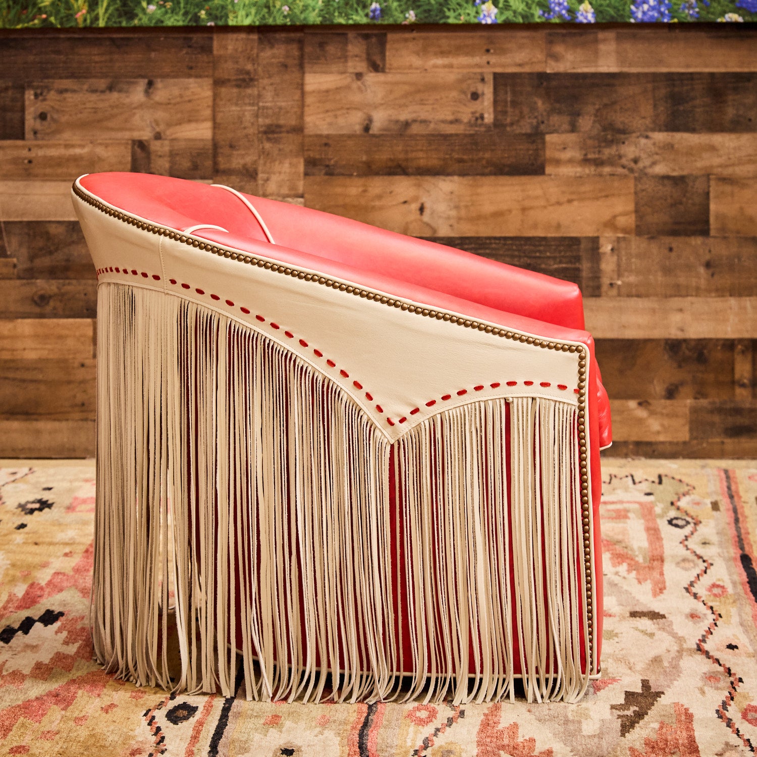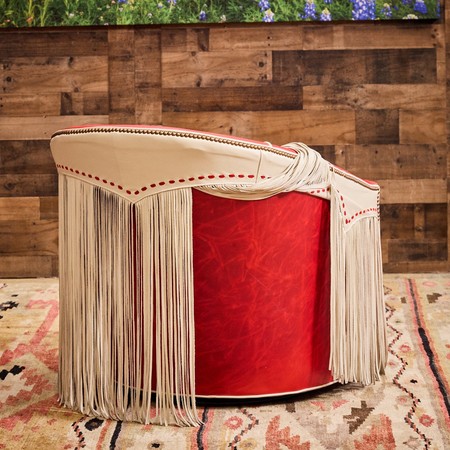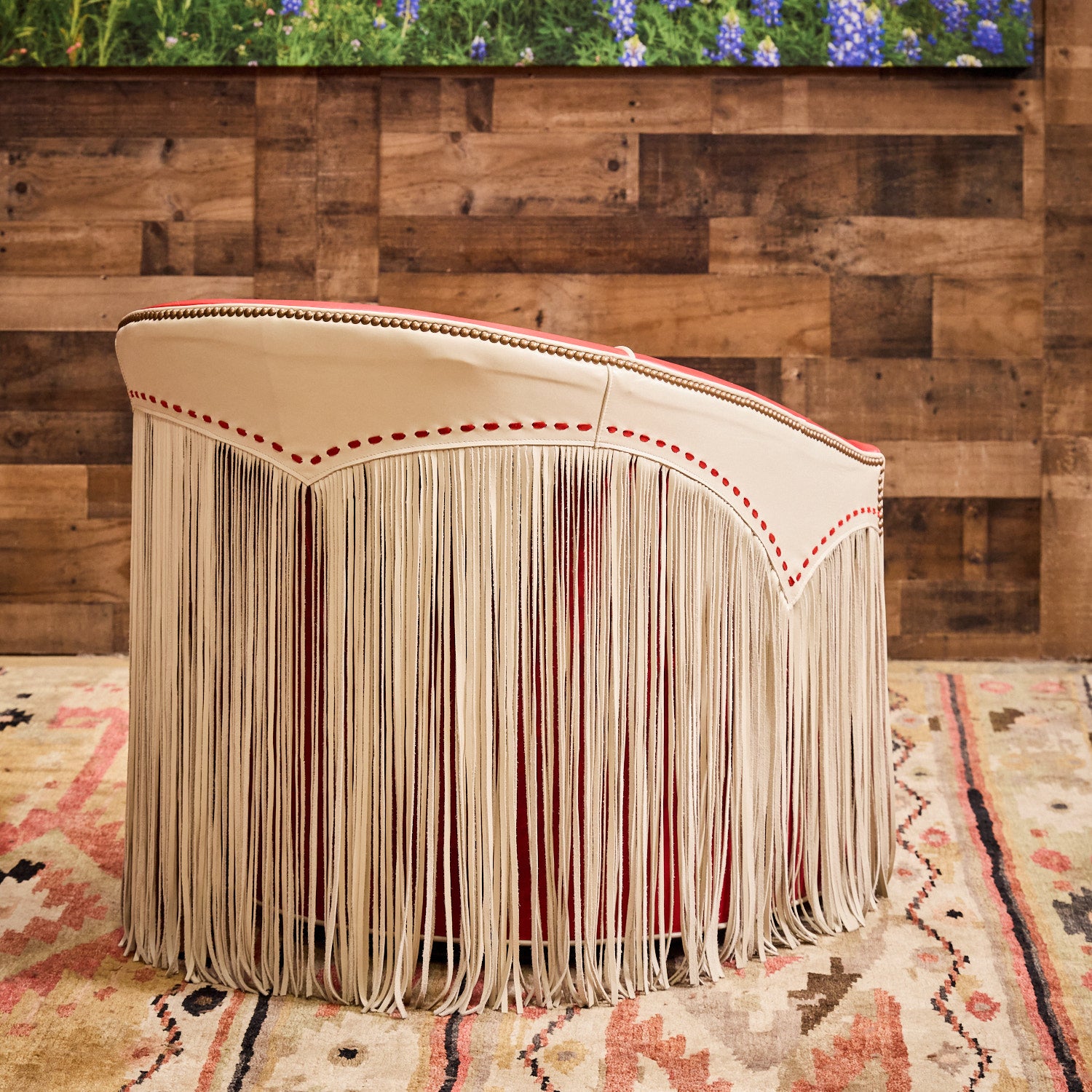 Add the perfect touch of Western chic to your home with the Cinch Red Leather Swivel Chair.  Shown here in a buttery soft red-color top grain leather these fun American-made beauties are outfitted with leather lacing, long hand-cut leather fringe and contrasting piping.  Each chair is equipped with a 360-degree swivel motion for more functionality and comfort.  The boot stitch accent on the front lower rail (optional) provides a subtle Western accent that will instantly be the envy of your family & guests!