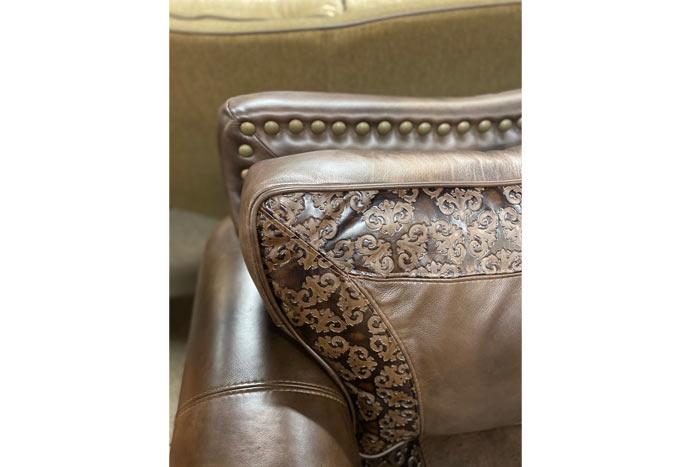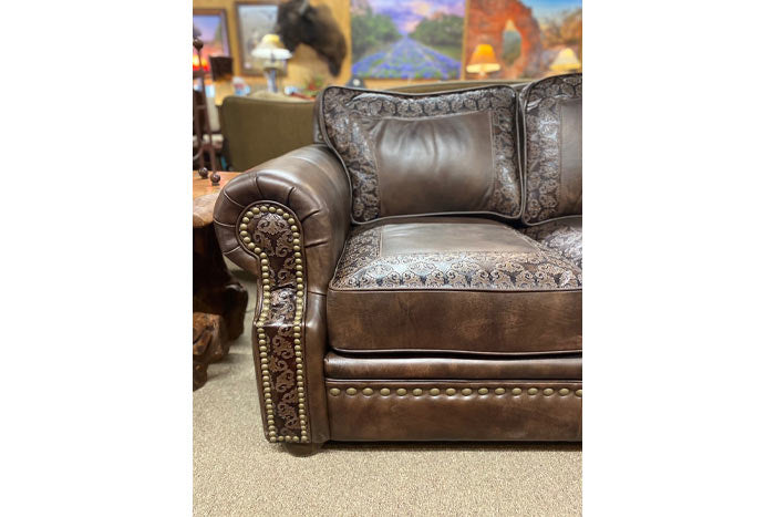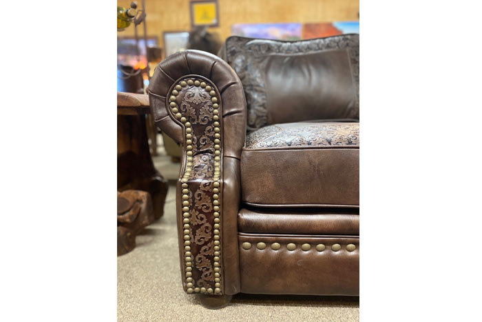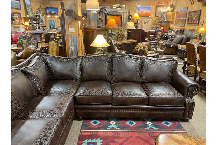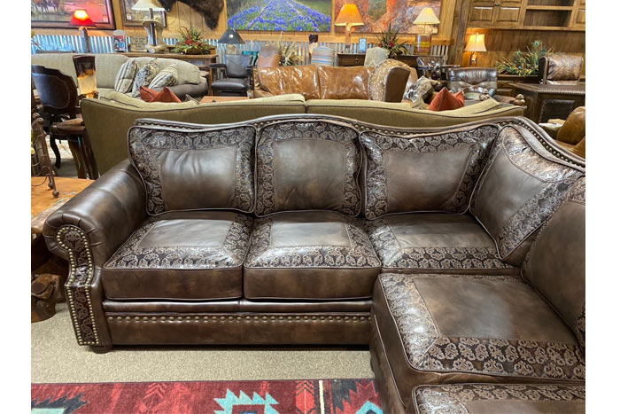 The Adobe Western Leather Sectional Sofa is perfect for those looking for ample seating with a unique, comfy style. Shown here in a supple chocolate brown top-grain leather with eye-catching embossed leather accent (optional). Topped off with antique nailhead trim throughout. MADE IN THE USA.
