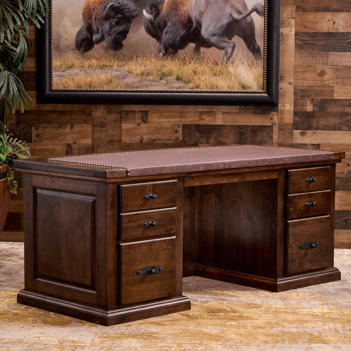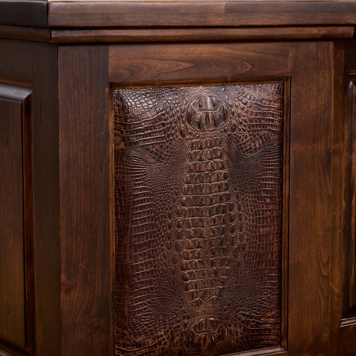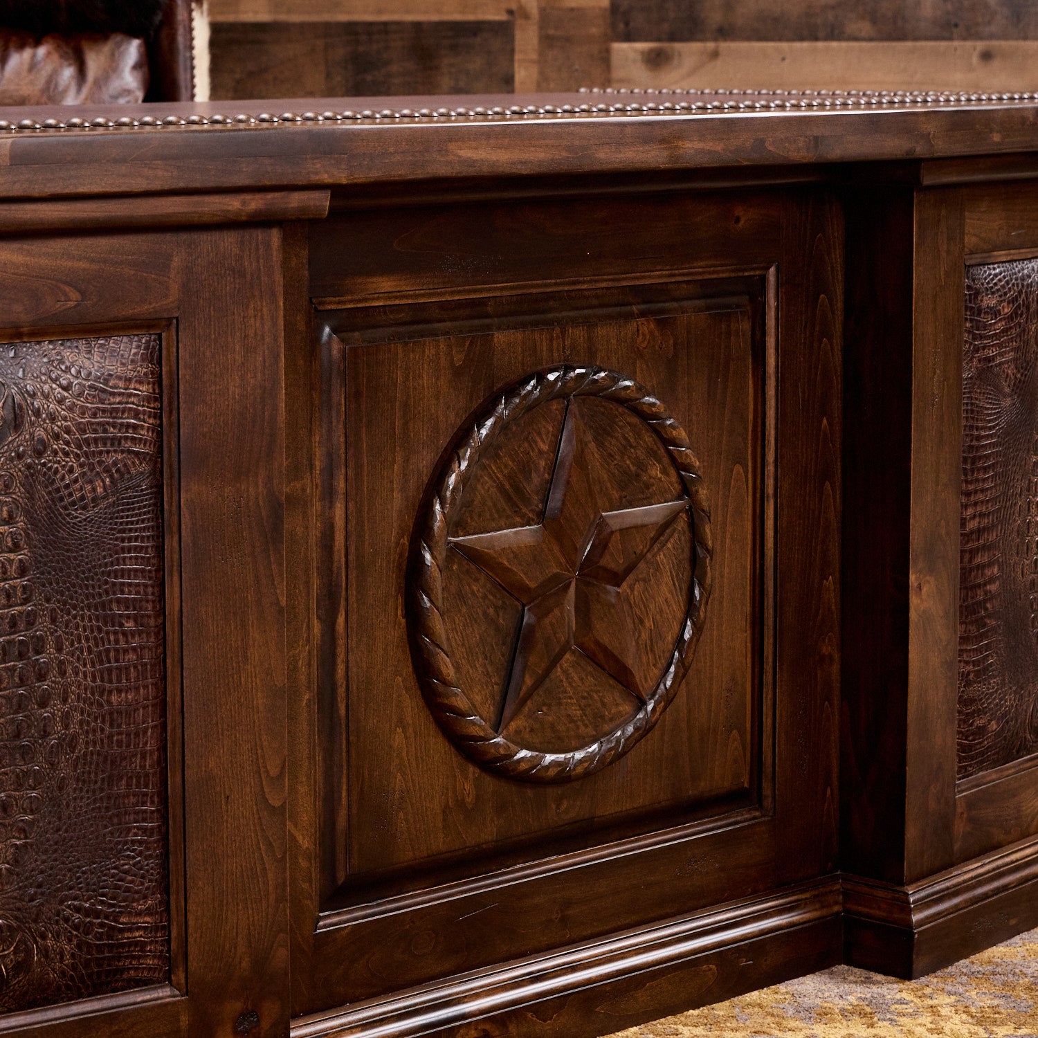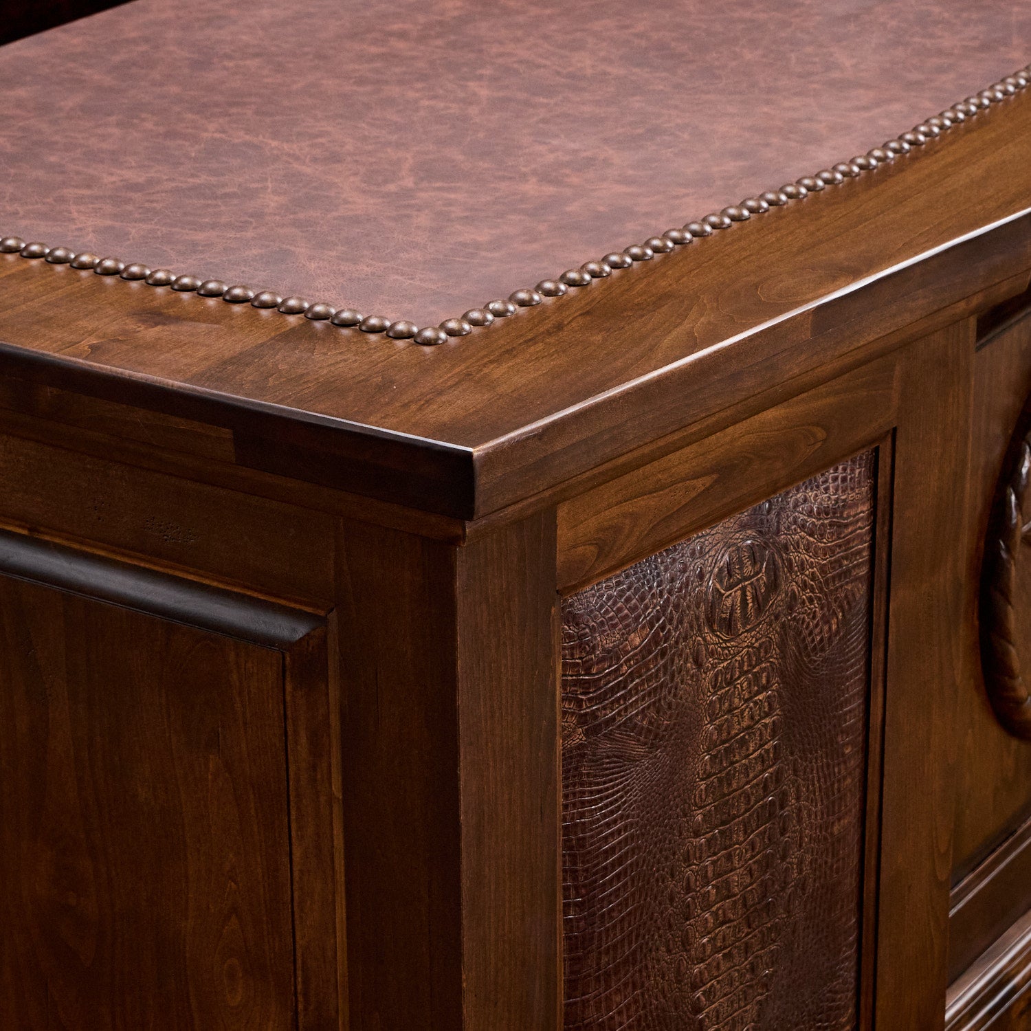 Manage your business in rustic, elegant style with the Alamo Office Desk I. Made of solid American knotty alder wood and shown here with rich, masculine embossed gator leather accents on the outer front panels, while the front center panel boasts a hand-carved star (optional). Desk top is also outfitted with a handsome top grain leather & antiqued nailhead trim.
