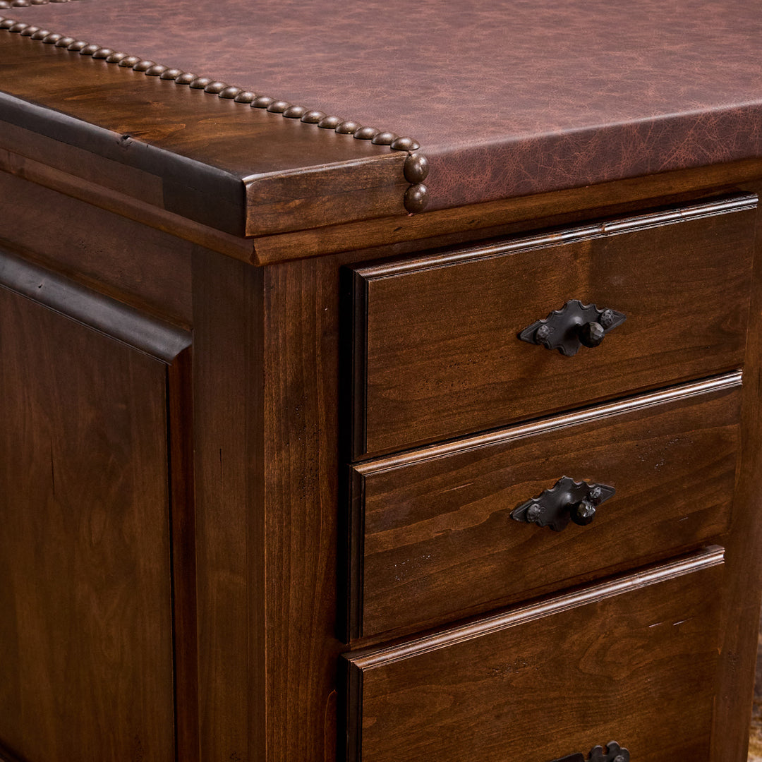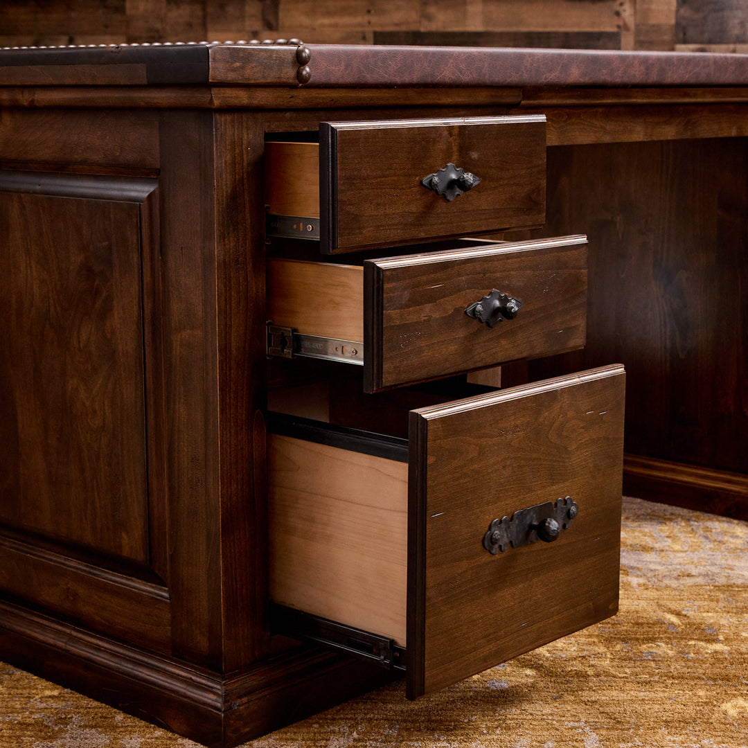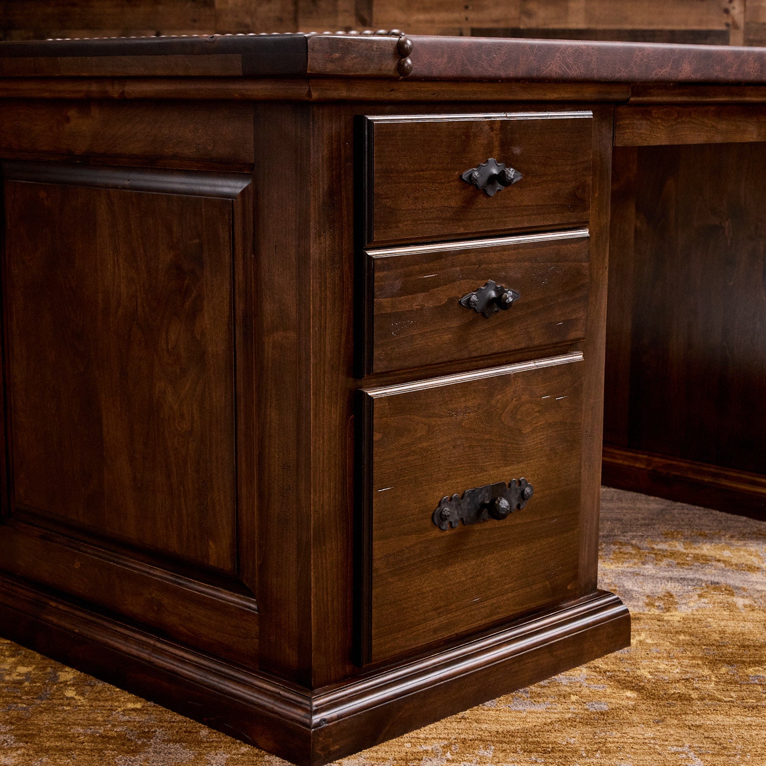 Manage your business in rustic, elegant style with the Alamo Office Desk I. Made of solid American knotty alder wood and shown here with rich, masculine embossed gator leather accents on the outer front panels, while the front center panel boasts a hand-carved star (optional). Desk top is also outfitted with a handsome top grain leather & antiqued nailhead trim.