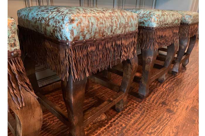 Add the perfect touch of classy Western charm to your bar, kitchen island, or game room with our Andres Driftwood leather stool. Built on a solid knotty alder wood frame and outfitted in an eye-catching turquoise pattern leather with hand-twisted leather fringe (optional). The leather shown offers copper-color hues, which only adds to the unique rustic appeal of these Texas-made stools. Available in standard bar stool height (30" seat height) or counter stool height (24" seat height).
