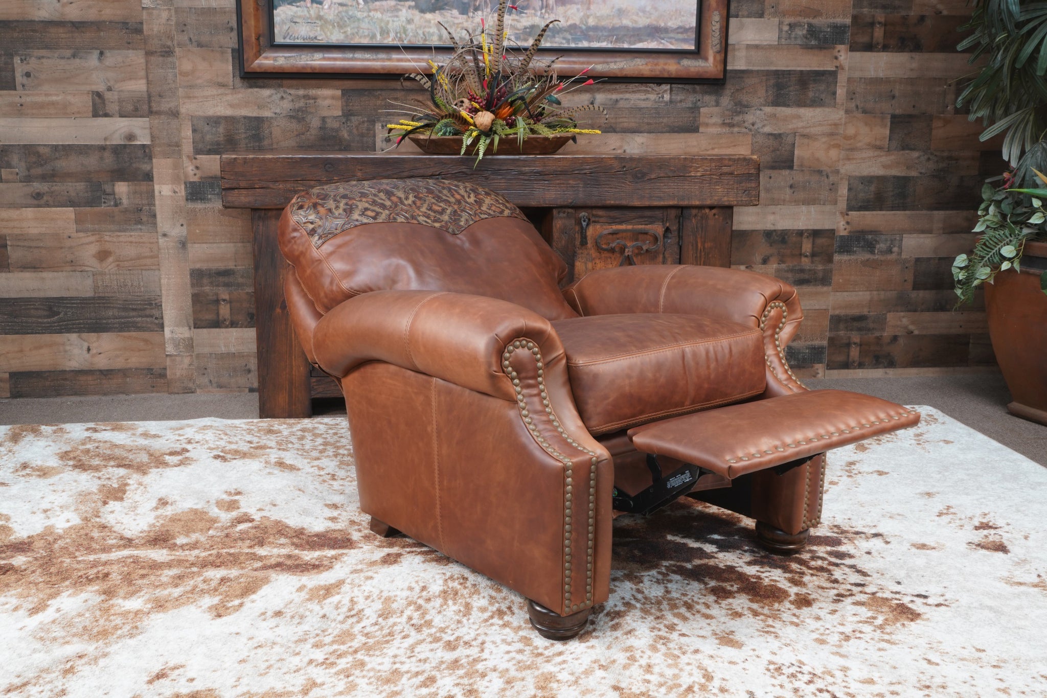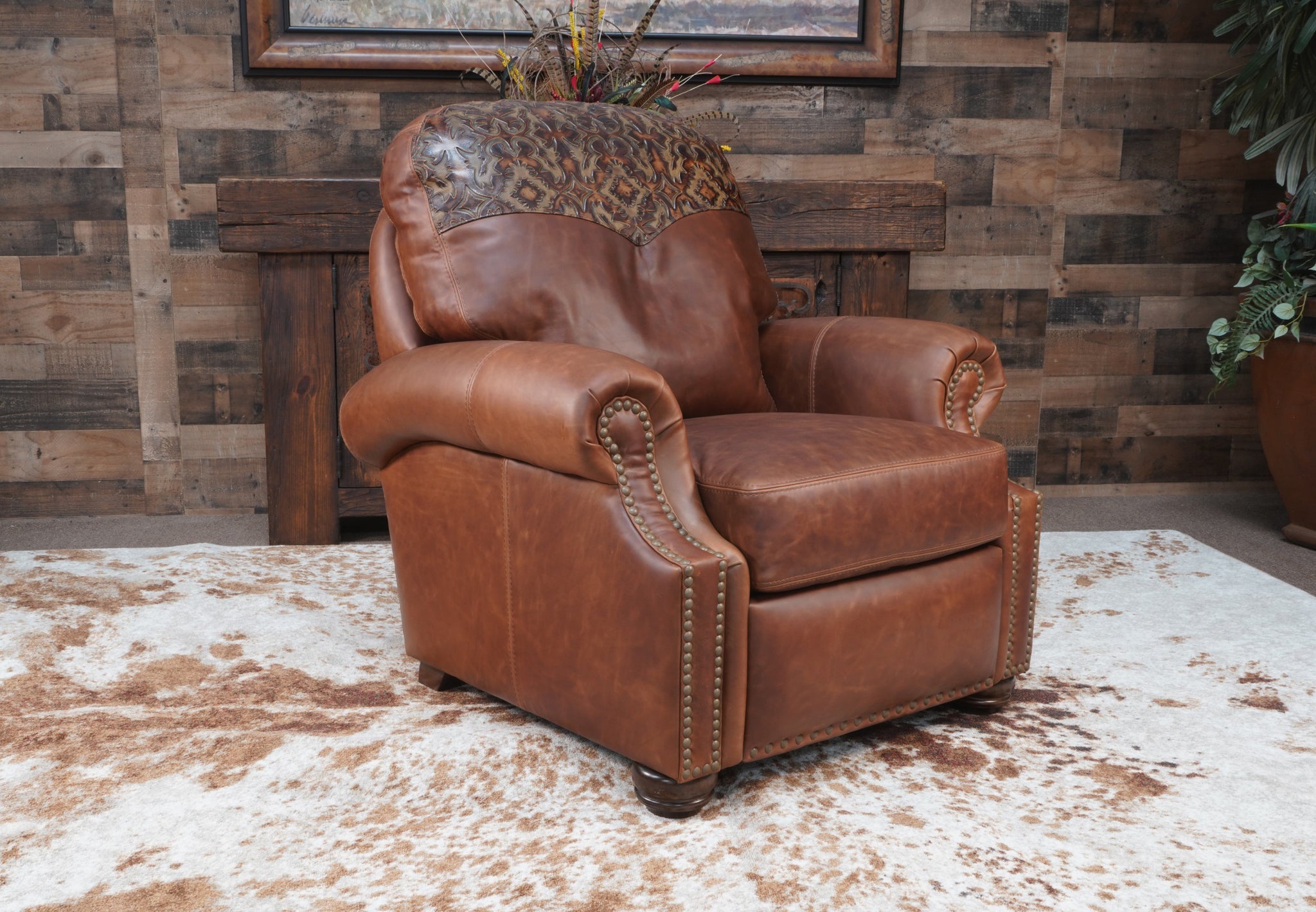 The Bandera Ranch Western Leather Recliner is the perfect answer if you're looking for a space-saver with tons of amazing comfort. Shown here in a buttery-soft full-grain leather accented with our popular Laredo Brown embossed accent leather. Rustic yet classy nailhead trim tops-off this American-made beauty that will provide the perfect place for movie or game night!