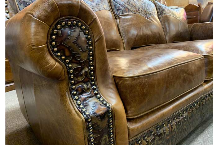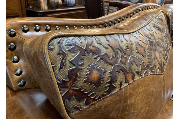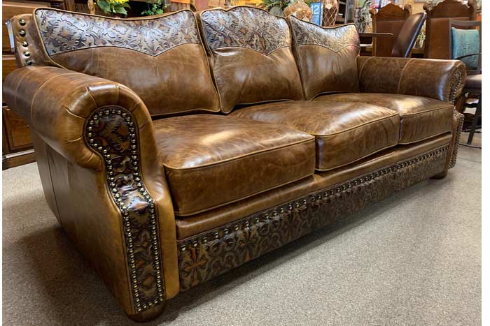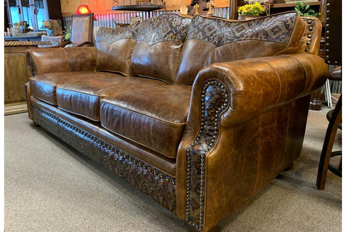 Indulge in the luxurious comfort of the Bosque Western Leather Sofa. This premium sofa is hand-crafted here in the USA with buttery-soft full grain leather, which will look even better over time with its distinctive character markings throughout. The upper back cushions are adorned with a charming embossed tooled leather pattern, adding a touch of true Western elegance that will set-off any home or office decor. Relax with loved ones for years to come on this inviting piece. Available in a variety of leather colors and accent combinations.  Contact us today to start designing a collection that will match your refined taste and unique style.
