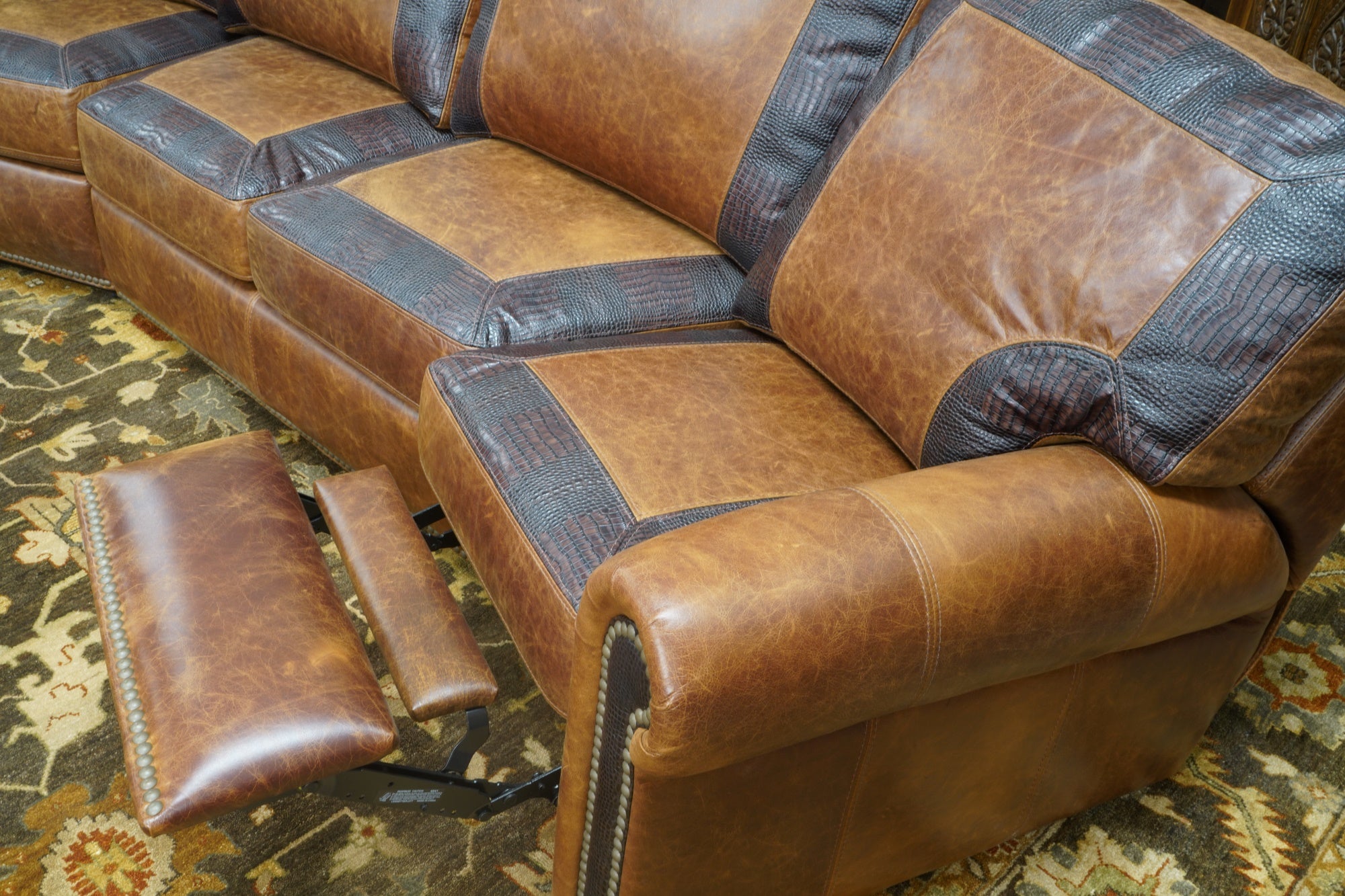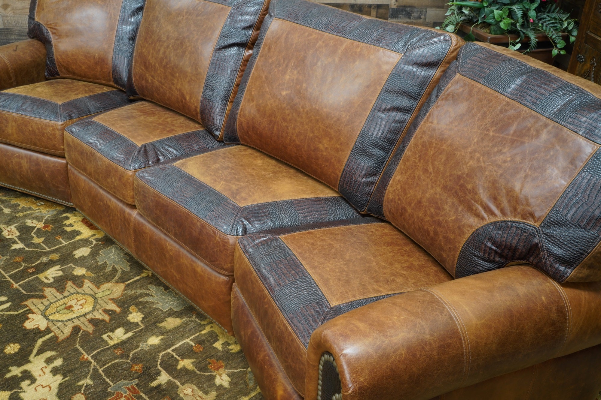 CUSTOMIZATION: Discover a wide range of luxurious leather colors and accent pairings to customize your own statement sofa marvel that truly showcases your individual style. Allow the skilled team at Hat Creek Interiors to help you craft a unique piece that is tailored to your sophisticated preferences.