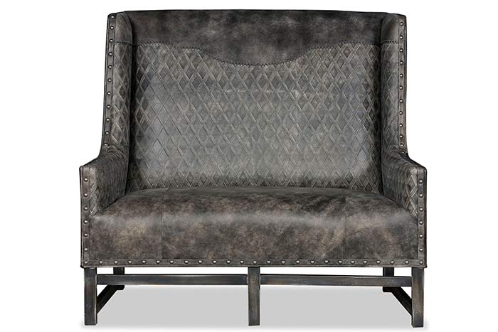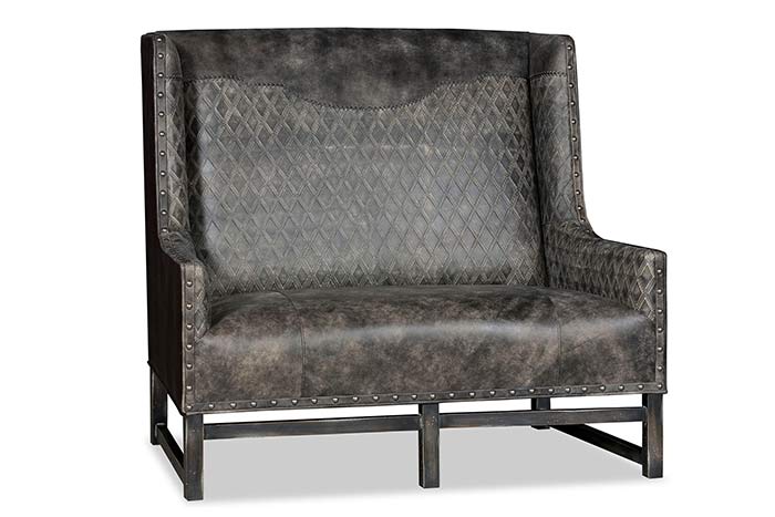 Our Gracie Settee is truly a work of art! Expertly crafted here in the U.S. using only the highest quality materials. Shown here with a supple gray distressed leather and coordinating embossed leather accents. Measures approximately 51" W x 39" D x 47" H.