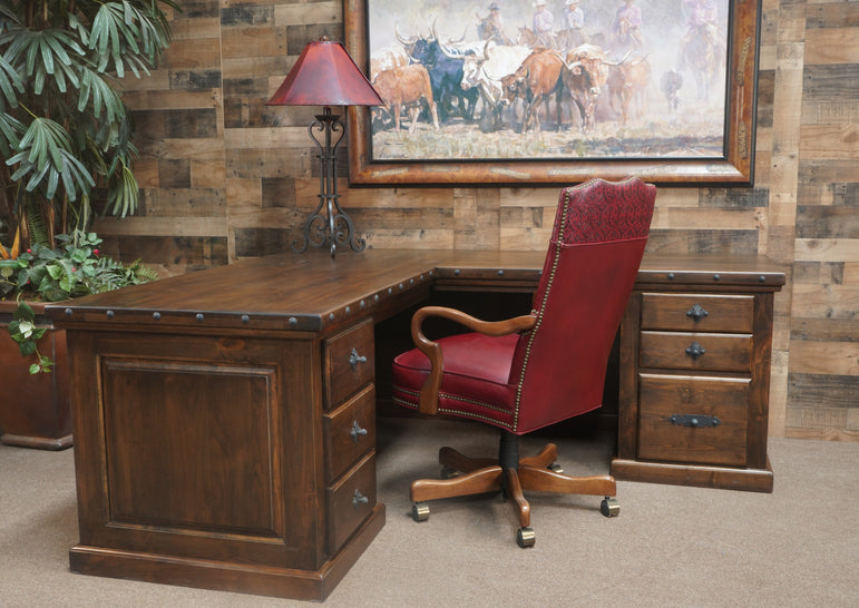 Tackle your day-to-day business in rich elegant Western style with the El Paso Alder Office Desk.  Each desk is carefully hand-crafted out of 100% solid American alder wood, which offers a rock-solid piece that will provide beauty & comfort to your office space for years to come!  Alder wood is a beautiful solid hardwood, harvested here in the USA, with a warm grain pattern throughout.  Each desk is accented with rustic drawer pulls and clavos (nailheads - Optional) along the edges to offer the perfect touch of Spanish/Hacienda flare.  All drawers are equipped with smooth full-extension drawer glides for easy use and functionality.