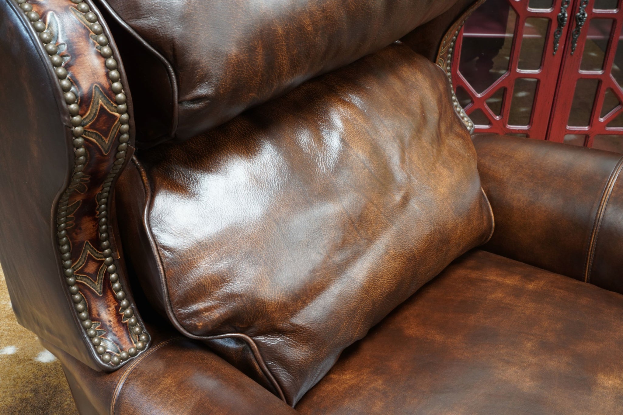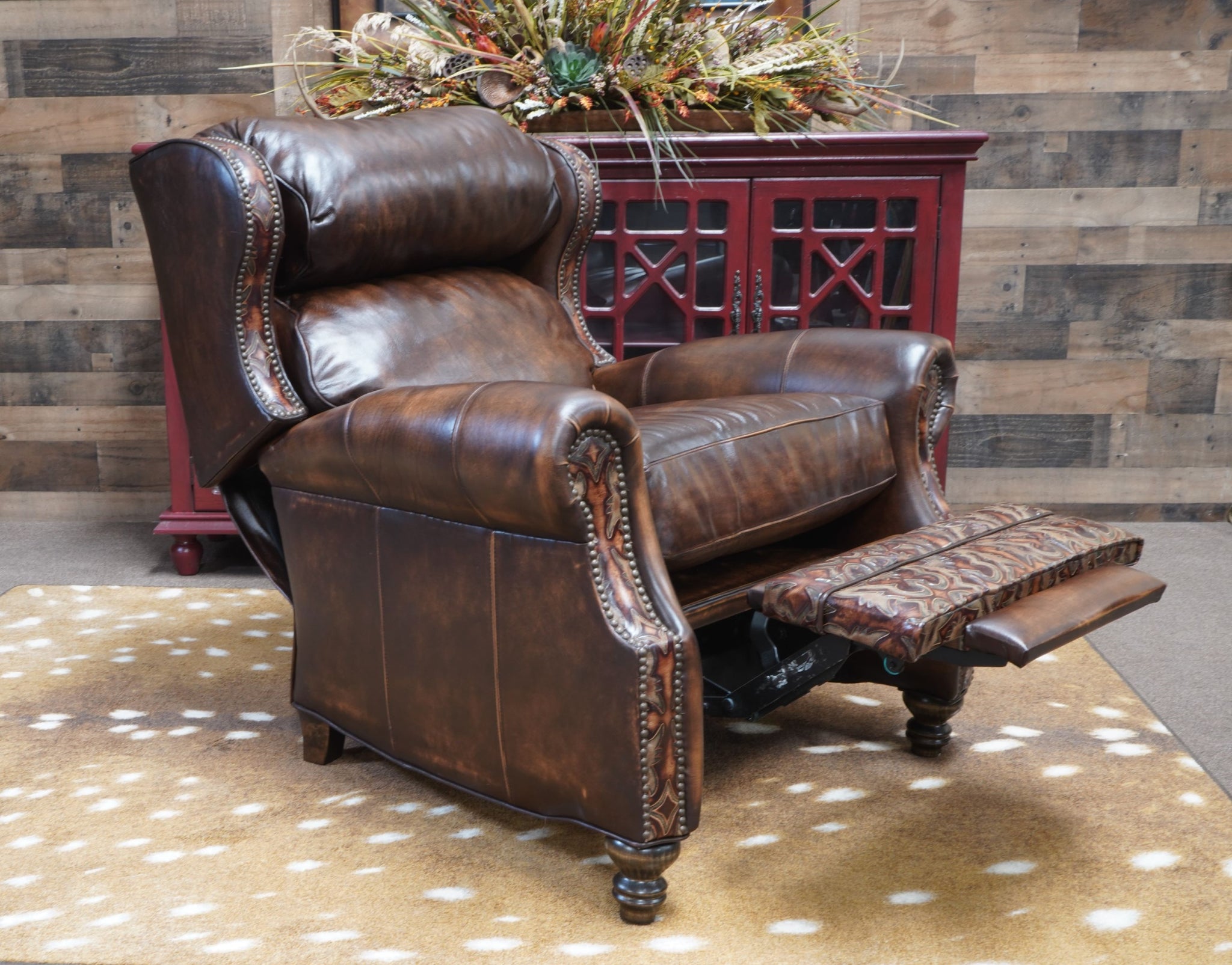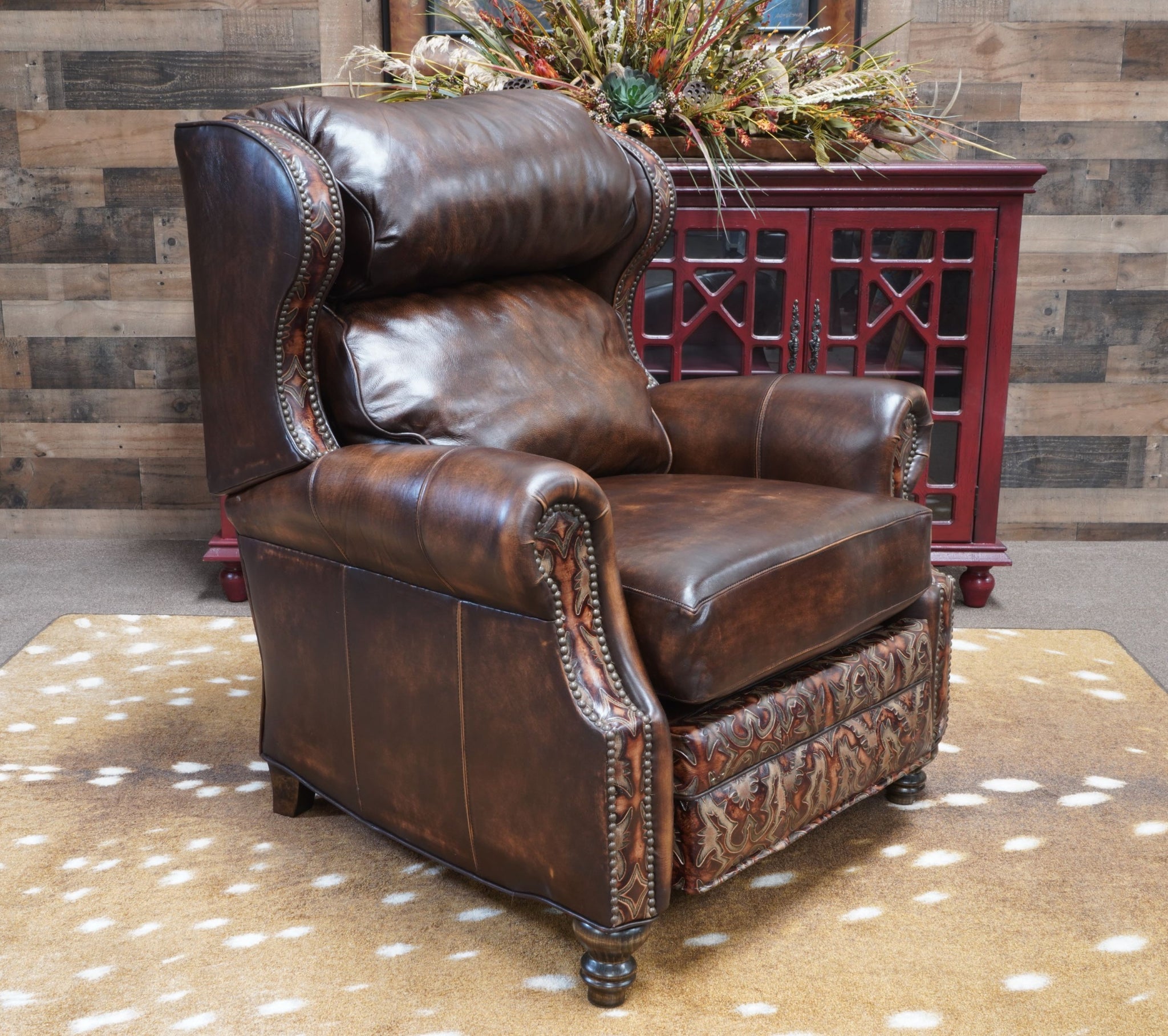 CUSTOMIZATION: Discover a wide range of luxurious leather colors and accent pairings to customize your own high-end Western luxury recliner that truly showcases your individual style. Allow the skilled team at Hat Creek Interiors to help you craft a unique piece that is tailored to your sophisticated preferences.