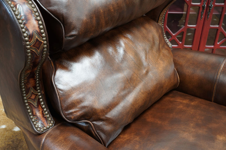 Are you looking for a recliner that's the precise combination of rustic Western elegance to highlight your space? The Caldona Bustle Back Recliner features unique hand-burnished leather wrapped around the sides and entire outer back. Perfectly accented with beautifully embossed tooled leather along the trim and lower leg support and finished-off with antique nailhead trim throughout. Kick-back in warm leather luxury with your very own Caldona Bustle Back Recliner!