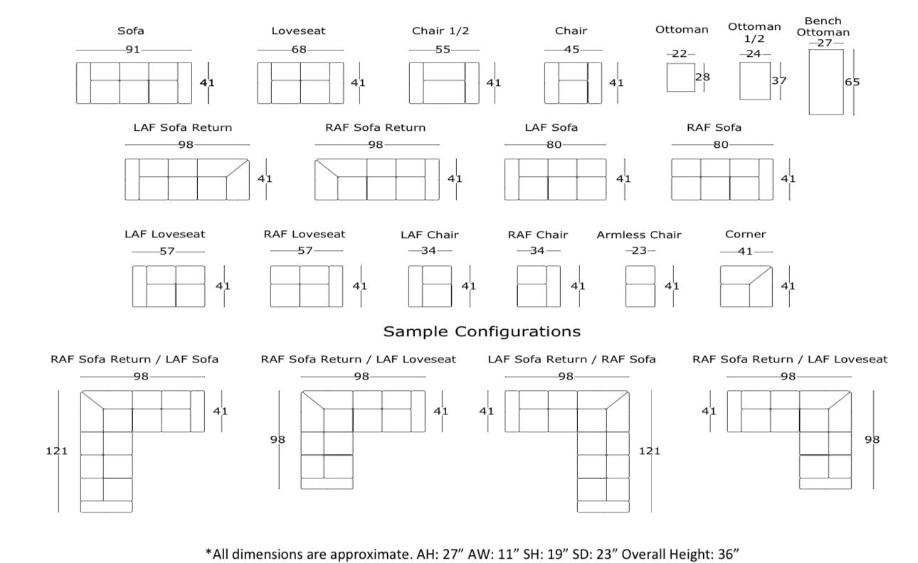 Sofa measures approximately 91" W x 36" H x 41" D; Inside Width 69"; Seat Height 19"; Seat Depth 23"; Arm Width 11"; Arm Height 27"