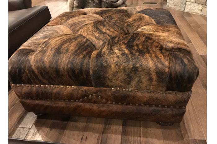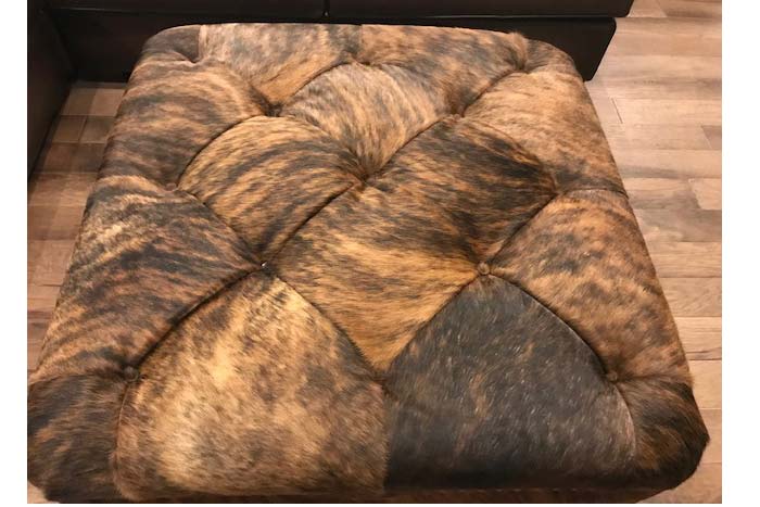 This ottoman is intricately had-tufted! Fashioned with exotic Brazilian brindle cowhide.  Due to the unique characteristics of authentic Cowhide and various lighting conditions, actual finish and appearance will vary from image shown.  Made in the U.S. Measures 41"W x 41"D x 20"H.