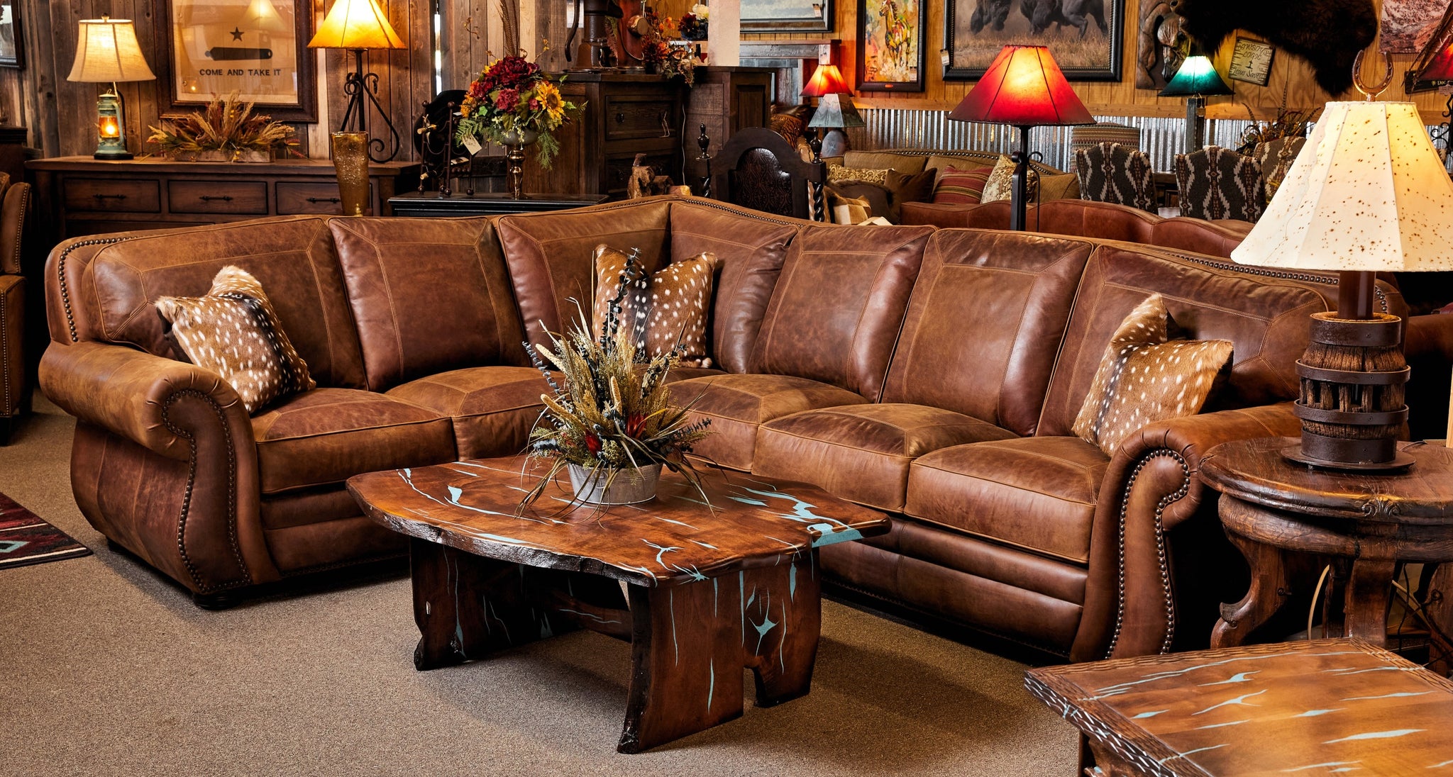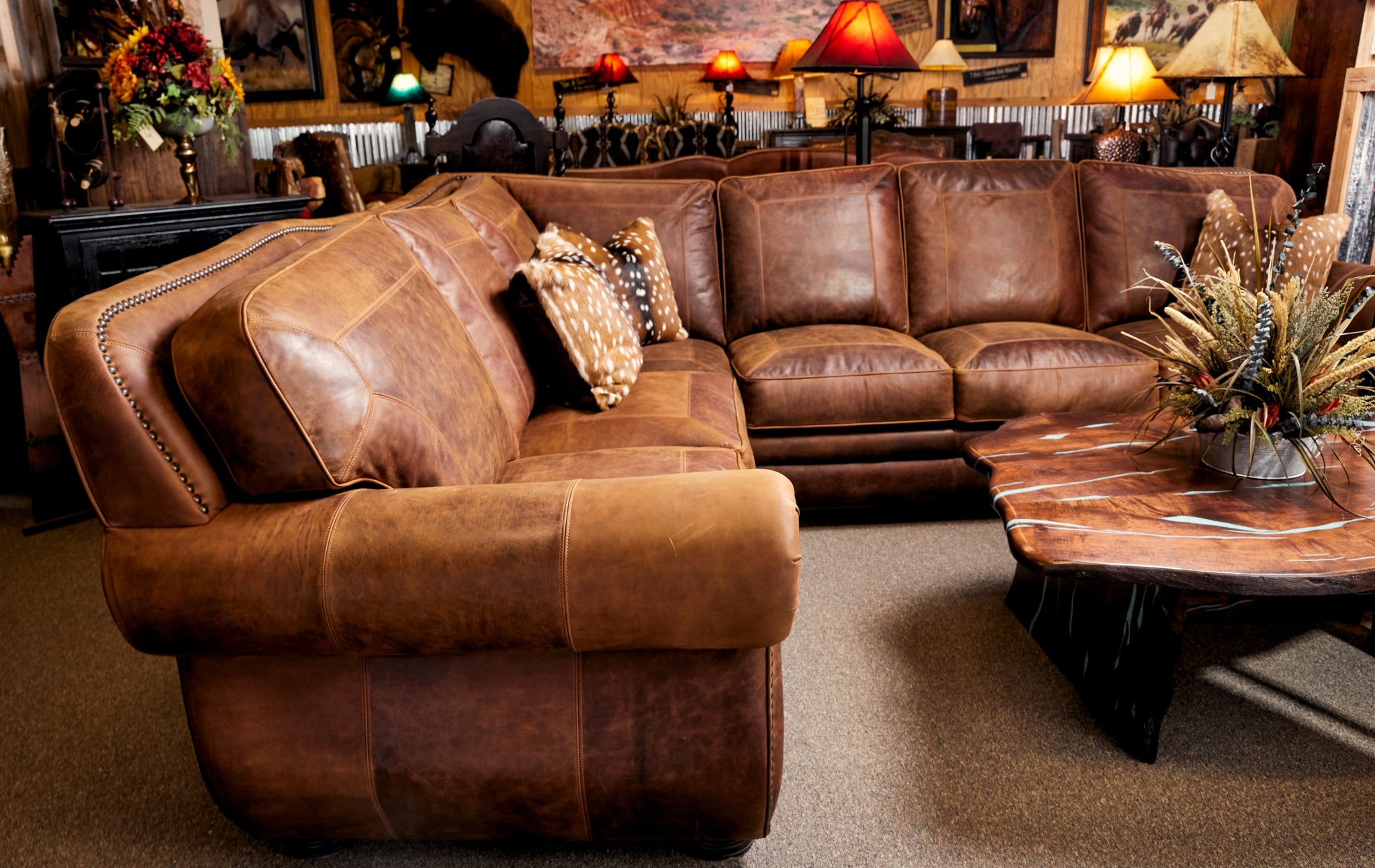 CUSTOMIZATION: Discover a wide range of luxurious leather colors and accent pairings to customize your own high-end Western luxury sectional sofa that truly showcases your individual style. Allow the skilled team at Hat Creek Interiors to help you craft a unique piece that is tailored to your sophisticated preferences.
