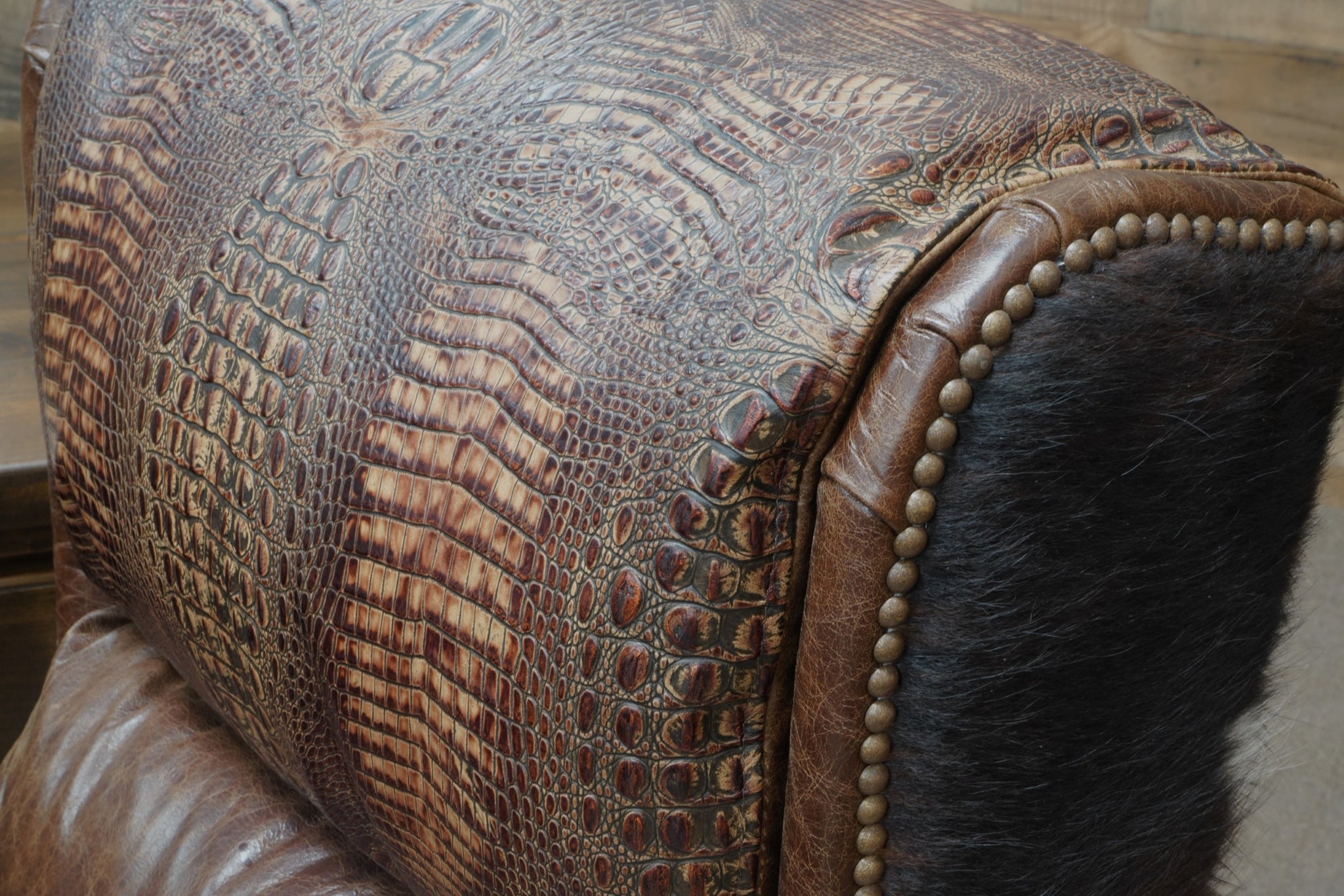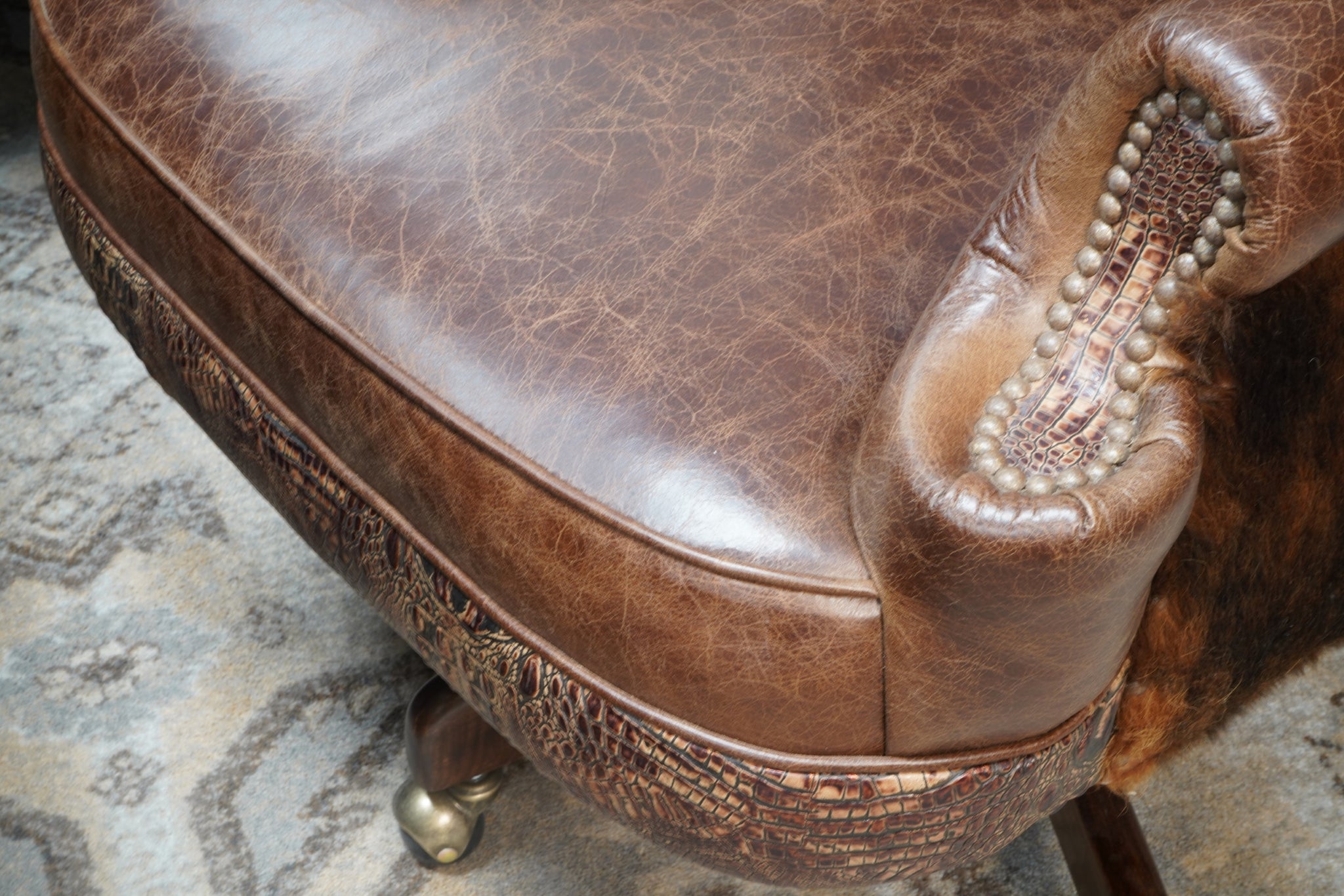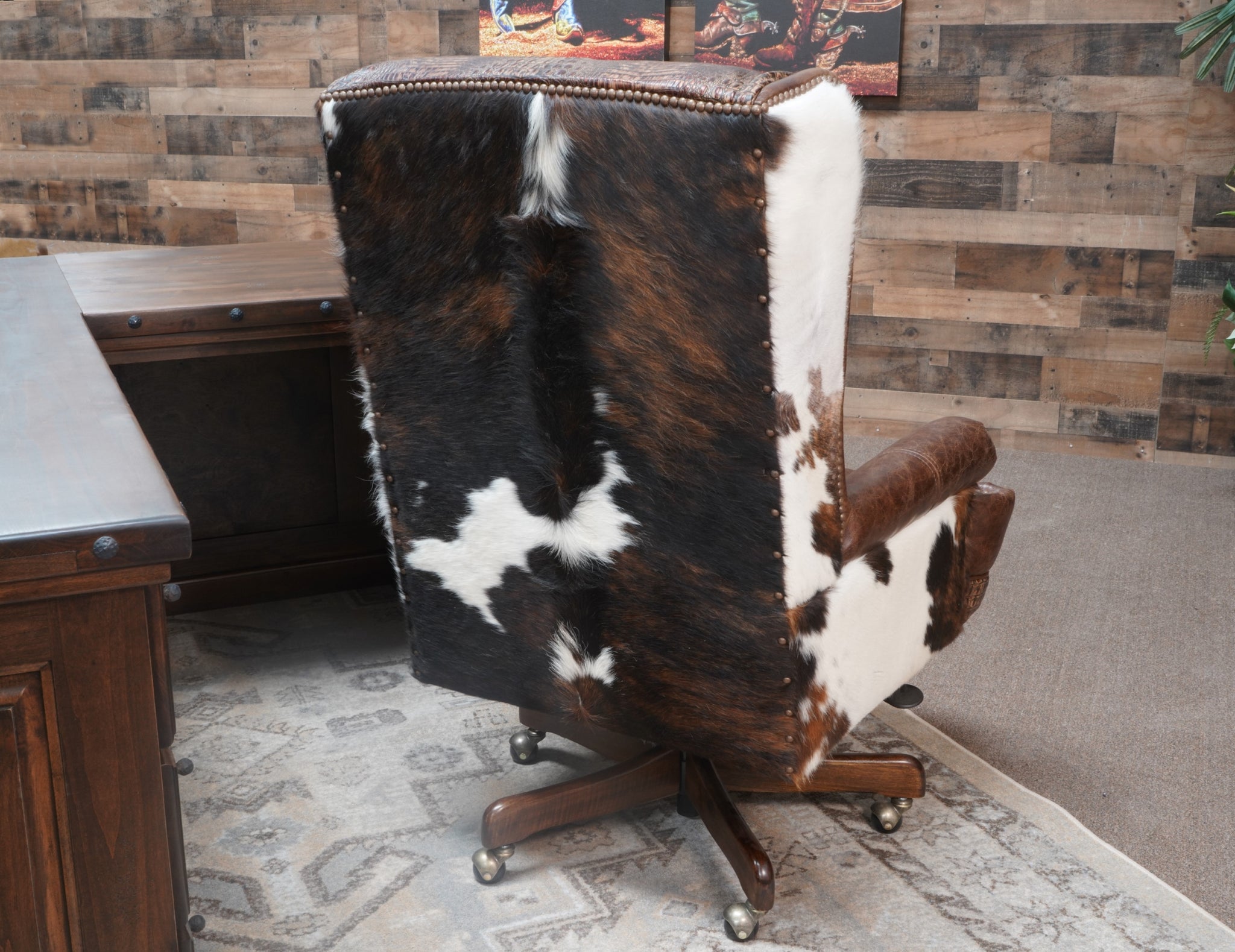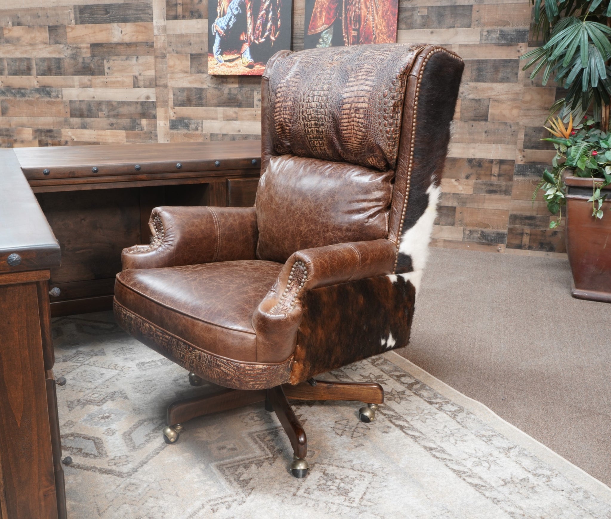 Looking for a unique and stylish office chair that will make a statement? Look no further than the Santa Fe Croc Western Office Chair! This one-of-a-kind chair features supple leather with tons of original character.  Accented with embossed croc leather and wrapped with an eye-catching tri-color cowhide.  Each chair is outfitted with a smooth swivel & tilt mechanism to provide lots of comfort throughout your workday.  Hand-crafted right here in Texas, so you can be sure of it's long-lasting durability and high quality.