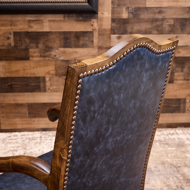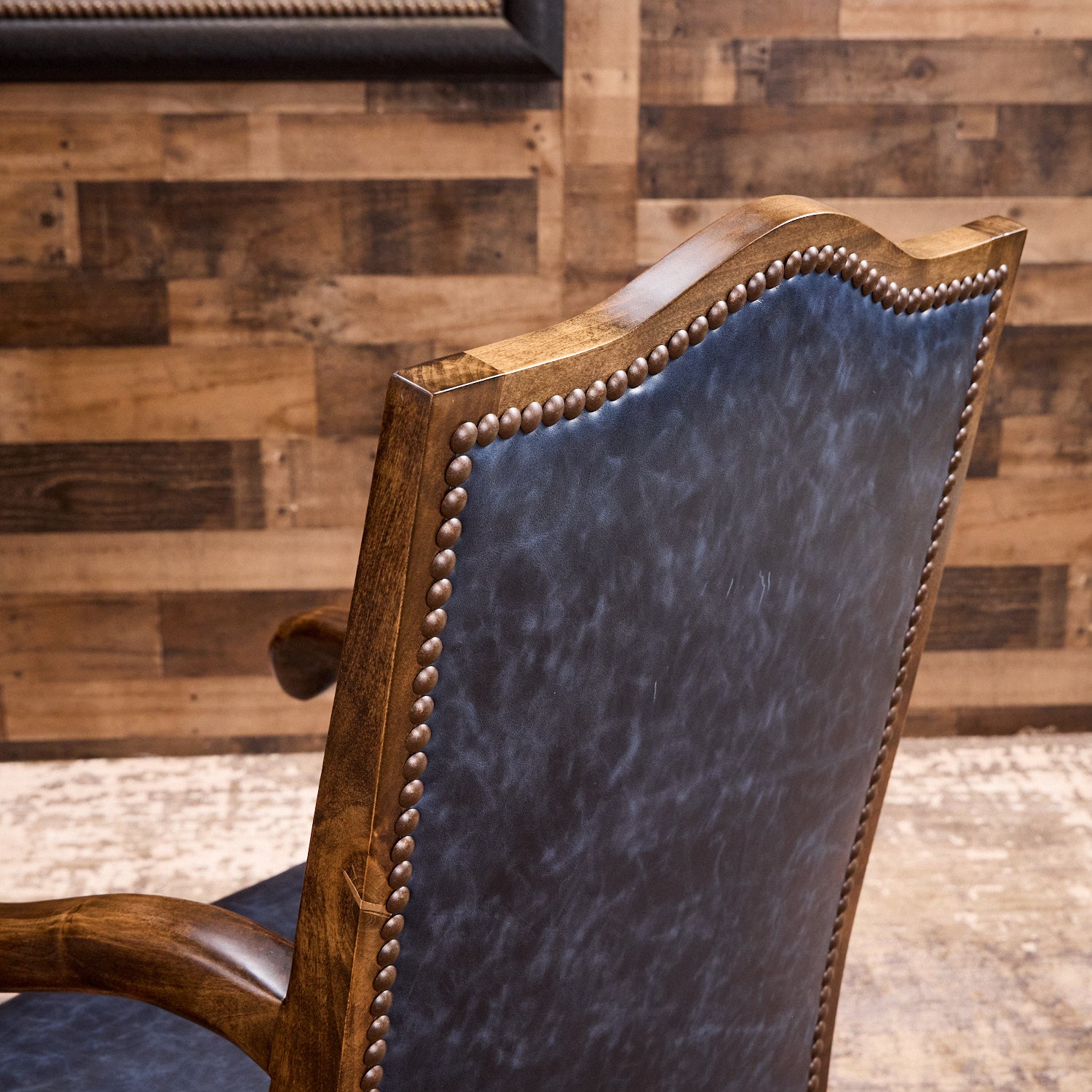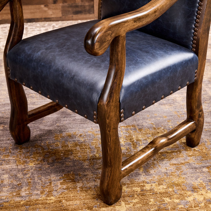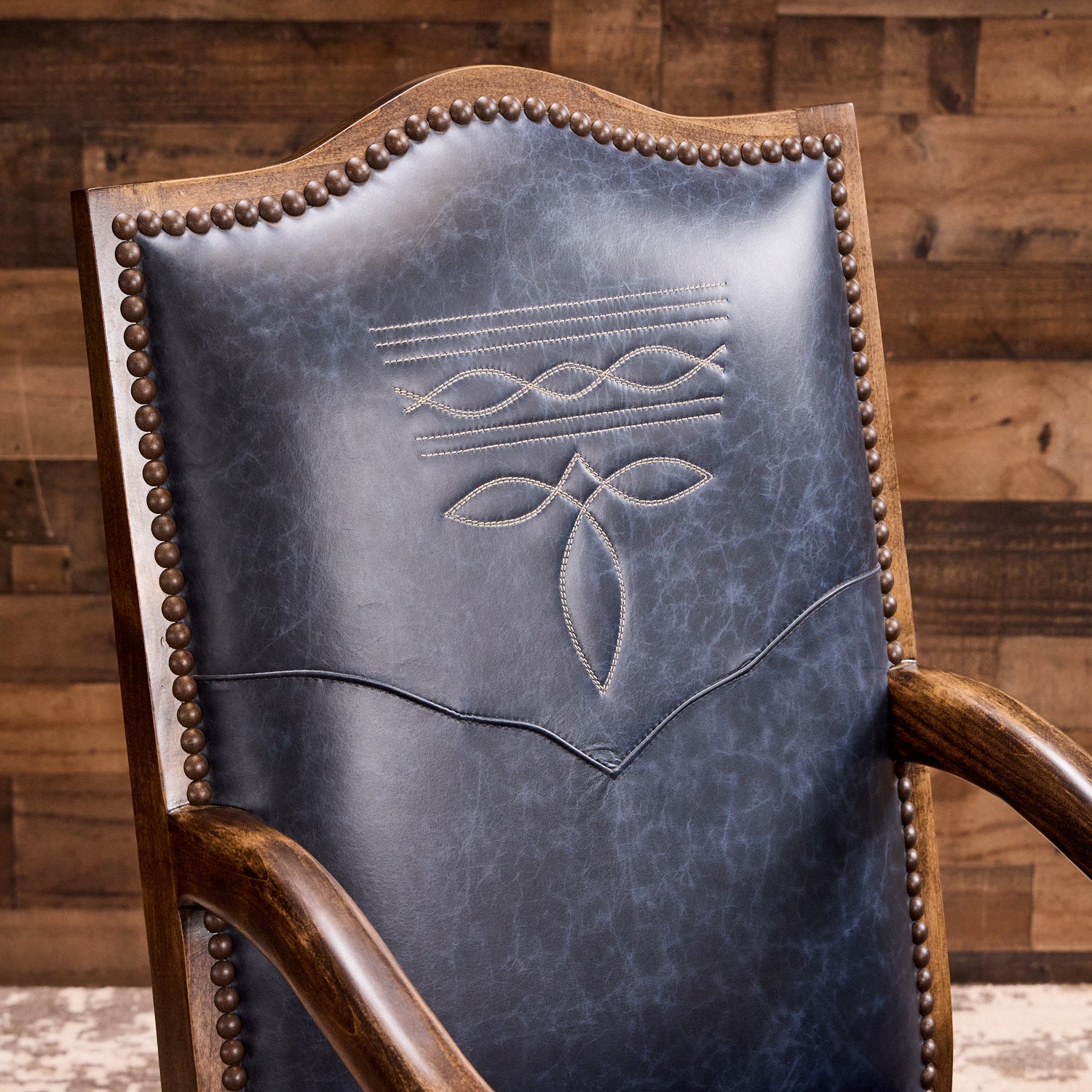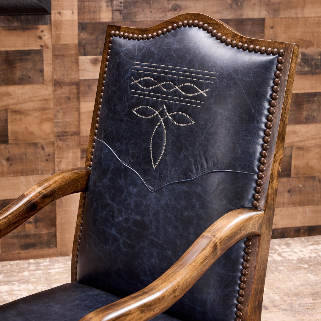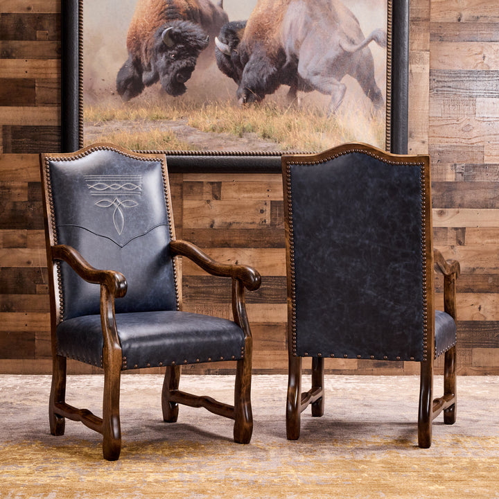 The Stetson Blue Western Leather Arm Chair is an ideal addition to your dining room or office, adding a touch of "rich ranch" style. Hand-crafted on a solid alder wood frame and featuring authentic top grain leather in a stylish deep blue color, this chair undergoes a hand-antiquing process that results in versatile blue tones that can easily complement your existing furniture and decor. The boot stitch accent on the yoke stitched upper back adds a hint of Western sophistication to this Texas-made piece.