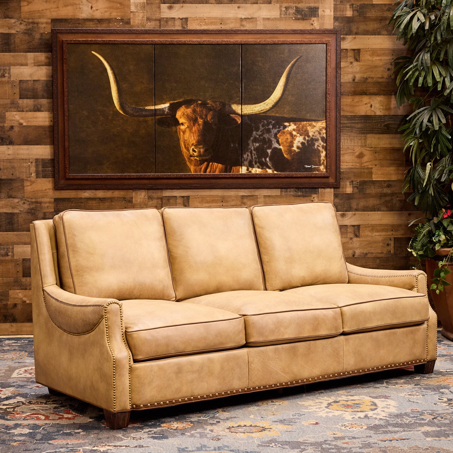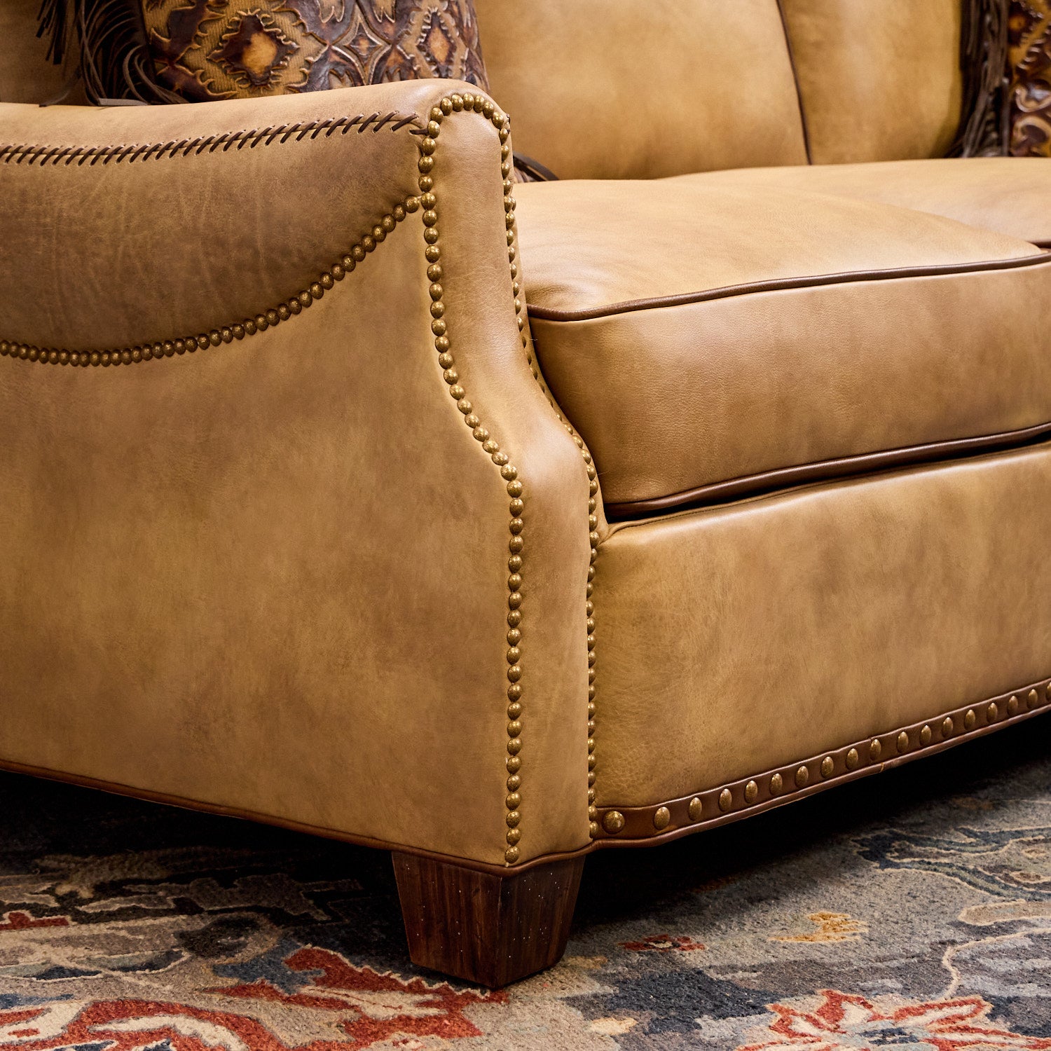 CUSTOMIZATION: Discover a wide range of luxurious leather colors and accent pairings to customize your own high-end Western leather sofa that truly showcases your individual style. Trust the skilled team at Hat Creek Interiors to help you craft a unique piece that is tailored to your sophisticated preferences.